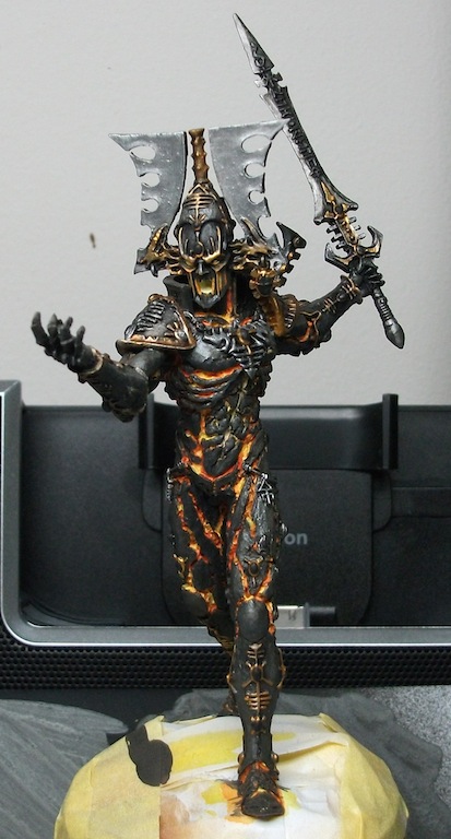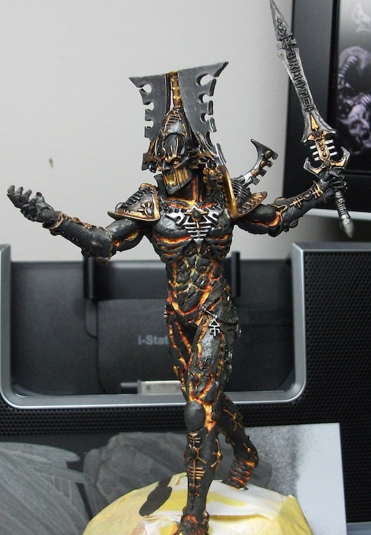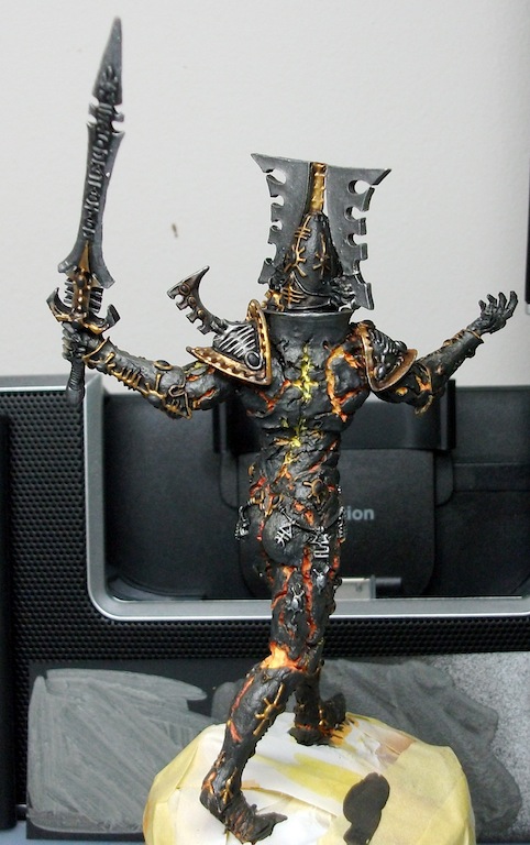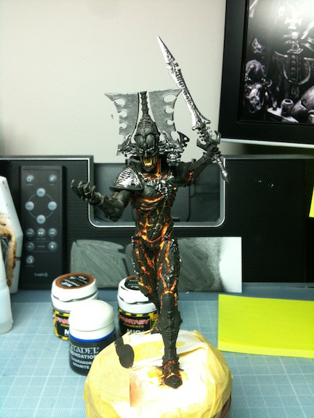 I brushed on with a medium sized brush heavily thinned layers (6-ish parts water to 1 part paint) of 2x shades first then 2x highlights concentrating more highlights on the upper body. In fact i don't think i highlighted the bottom half apart from the top of the feet. I suppose it would be termed as Zenithal highlighting. I prefer this method to the traditional GW fine-line-on-the-edges highlights as it looks more 'realistic'. It's also quicker.