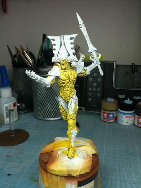 I basecoated, roughly, the face plated with Iyanden yellow foundation paint also. I'll go back and re-touch the edges with a fine brush later. Thats all I got done today but I'll hopefully get finished up tomorrow.