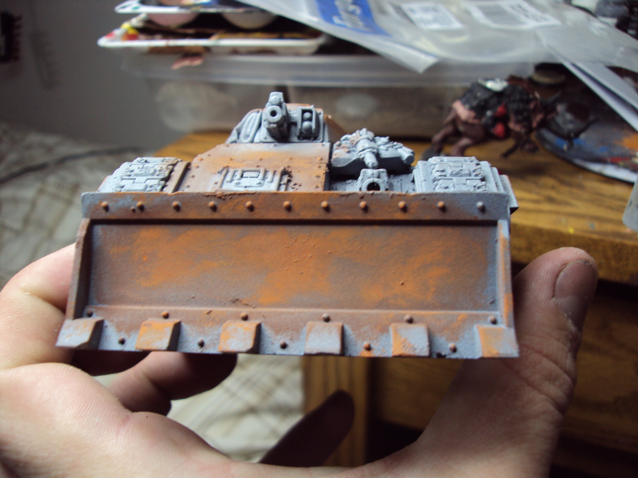 The weathering technique i use and im going to stick to. Conisdering the first salt attempt was dreadful. I use GW ogryn flesh, delvan mud, and watered down paint washes. I use about 1 part paint to 4 parts water. This way i will get a very slow concentration and build up. Any veteran player knows that once you overdo a wash you may as well start over. But i try to build up to the final colors. This way i also form almost a shadow casting effect as well.