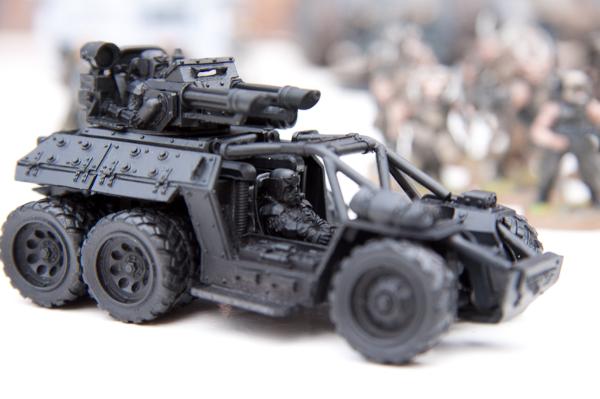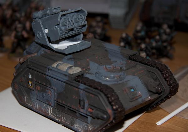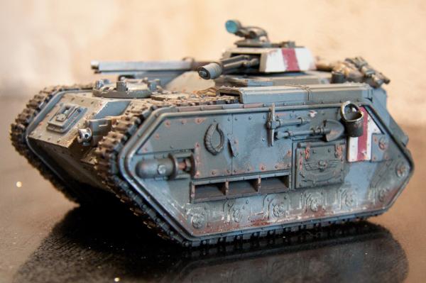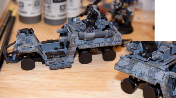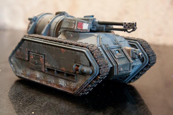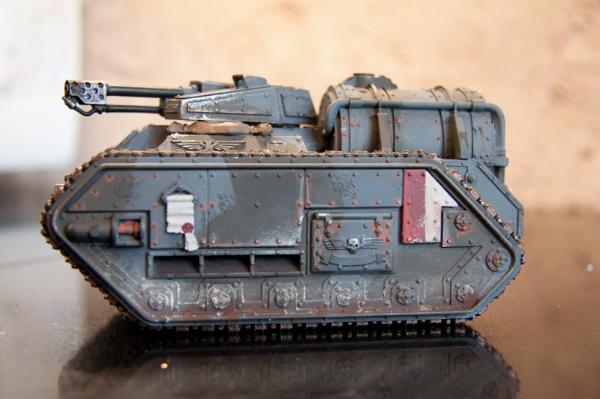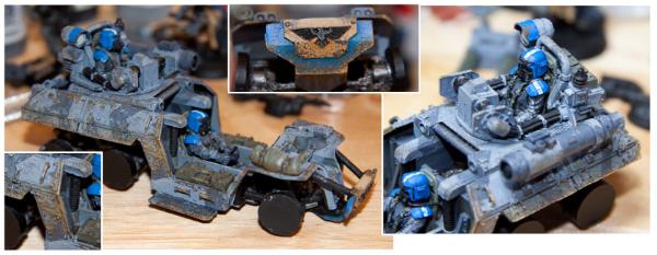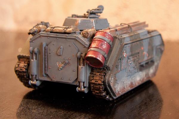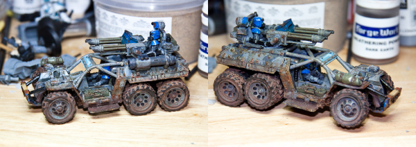 - 2 washes of very watered down Charadon Granite over the armour, packs and guns