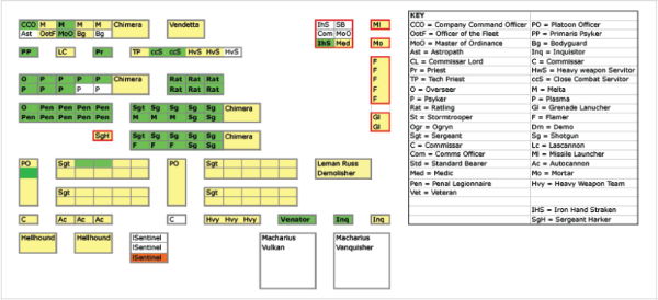 I've been reading through a few IG blogs outside of Dakka recently and a few of them are using painting charts to display the progress of their force. I thought this was a good idea, so here we go. This is mine: