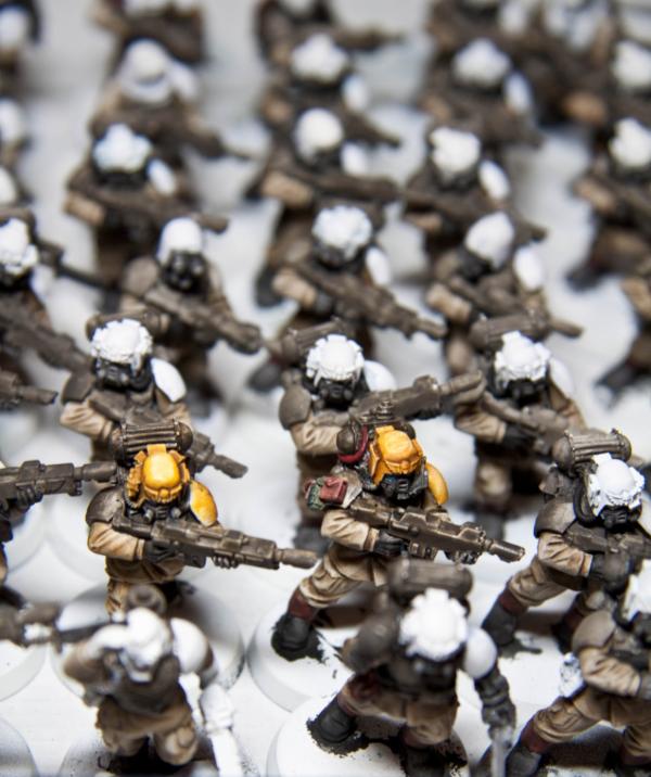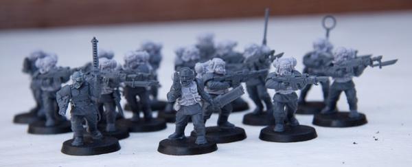 With that all sorted... I undercoated every platoon member and unpainted vet that I could find... including the heavy weapon teams. Seeing all of that in one place was a bit terrifying, so I limited batch one to just the Lasguns, sergeants, flamers, grenade launcher, comms guys and 2 meltas. Basically anything that could be in the standard infantry squads. After about 6 hours, this is what they looks like