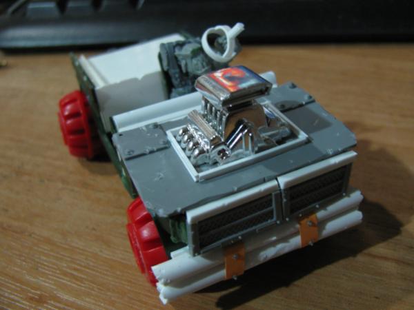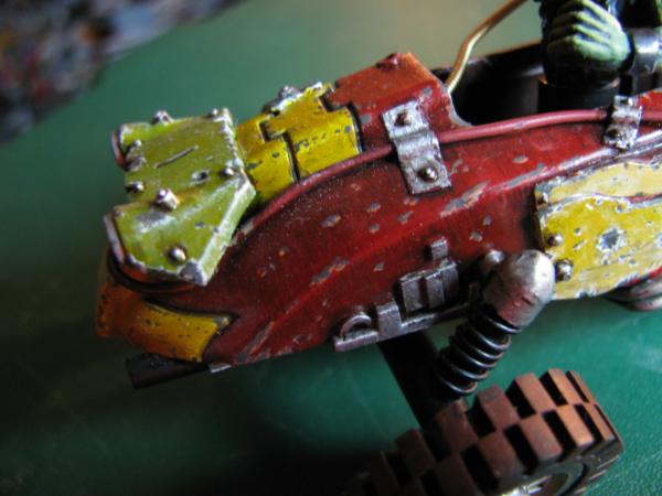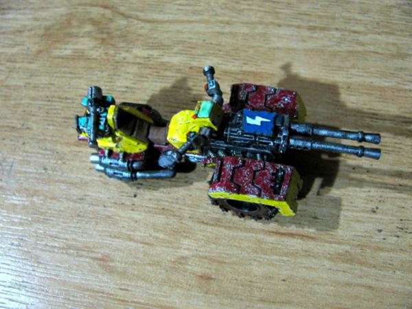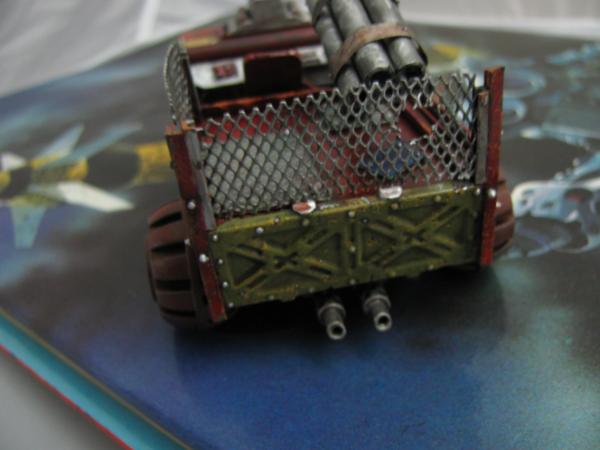 Rust is normally the last thing I apply. Normally Won't be much mud though as they're urban based, maybe just a smattering of gak. Decided against mud-guards when I was building, mek's don't care if the little gunner gets a bit of dirt sprayed on him Actually, still trying to decide if the engine block is going to be gleaming and spotless as a contrast to the chipped bodywork, or a solid, rusted up block. I like the idea of an ork deciding to keep the runnin's clean, something picked up from observing the 'umie meks, and the contrast should look interesting, possibly keep a pretty clean paint job on the intake too. The big pile of rusted engine is appealing because, well, because it's a big pile of rusted engine Yep, TTA Great Space Battles, I dug it out after discussing Space-Wrecks, and though it would make a suitable base