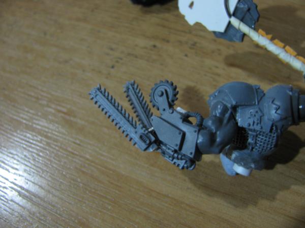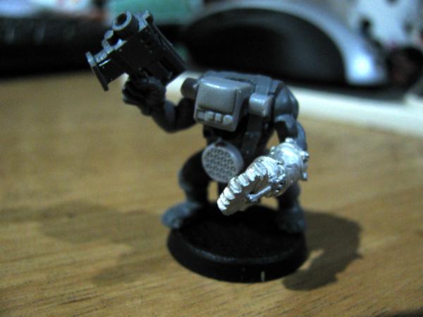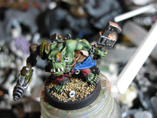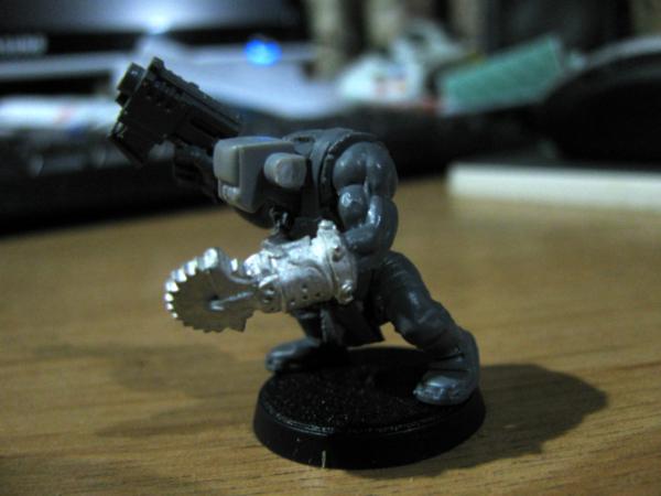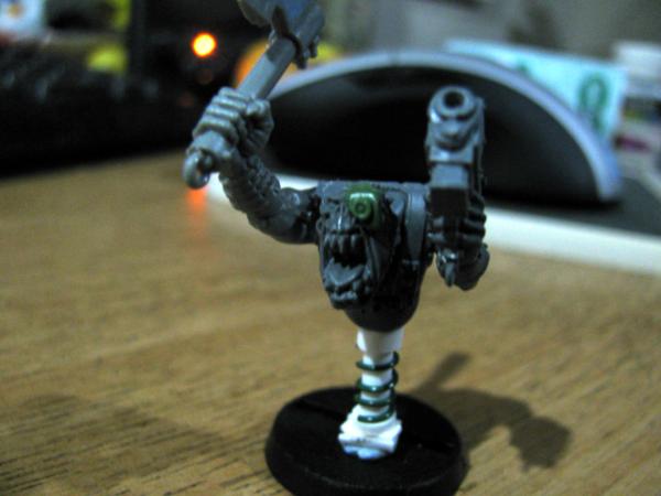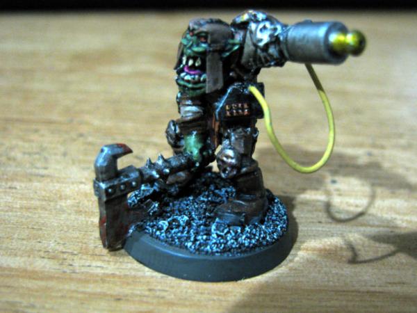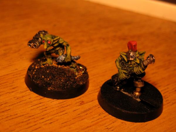 One v old plastic orc, which I made back in the day and have given him a chainsaw arm, an old ork 'bolter' and then left him as he was for no other reason than pure whimsy and nostalgia. I don't mind having a real mix of models in there as I'd imagine Upzag & Grimsnik attract a wide variety of freaks, plus I can always claim it to be a product of the Dok's eksperimentz. The other guy had part of his back replaced with a power pack, a burna mask and iron jaw for a head, and a drill-bit for an arm.