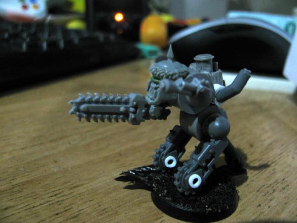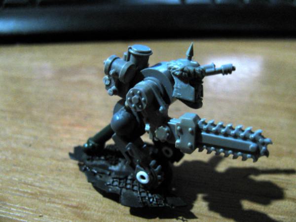 These two are still tac'd atm as they need some gs work before assembling, hopefully I'll find some gubbins to cover up my gs skills.The big guys got the legs of an epic warhound with the feet chopped off and a toe-piece from kroot armour. Part of a power klaw made up his choppa hand and he's had a chunk of head replaced w part of a scope - that's gonna need some gs. Also needs some thing around the back waist, connections or power supply or something. His little friend is powered by an epic rhino(old-skool again - even if I haven't improved my skills too much over the years, I have at least improved my bitz box ) with exhausts from a chaos biker. Old-skool plastic orc arm and a sm power fist, and space for a bit of gs to fill.