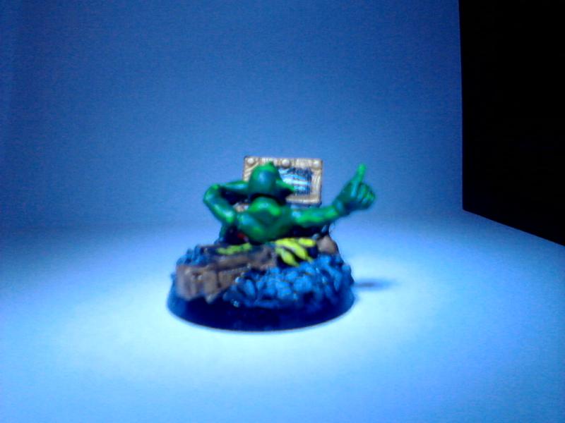 So, remind everyone about the keys to the self-portrait... it's basically an ork cybered up into a painting machine, which is what I feel like quite frequently. Air brush (slugga) in one hand attached to the compressor on his back, optivisor bolted to his head, lamp bolted to his chest with a grot prod / paintbrush in his right hand (as I often seem to be encouraging young painters to keep at it). It was... a lot of fun to make... and I'm quite happy with it. A nice compliment to all my excellently painted grots.
