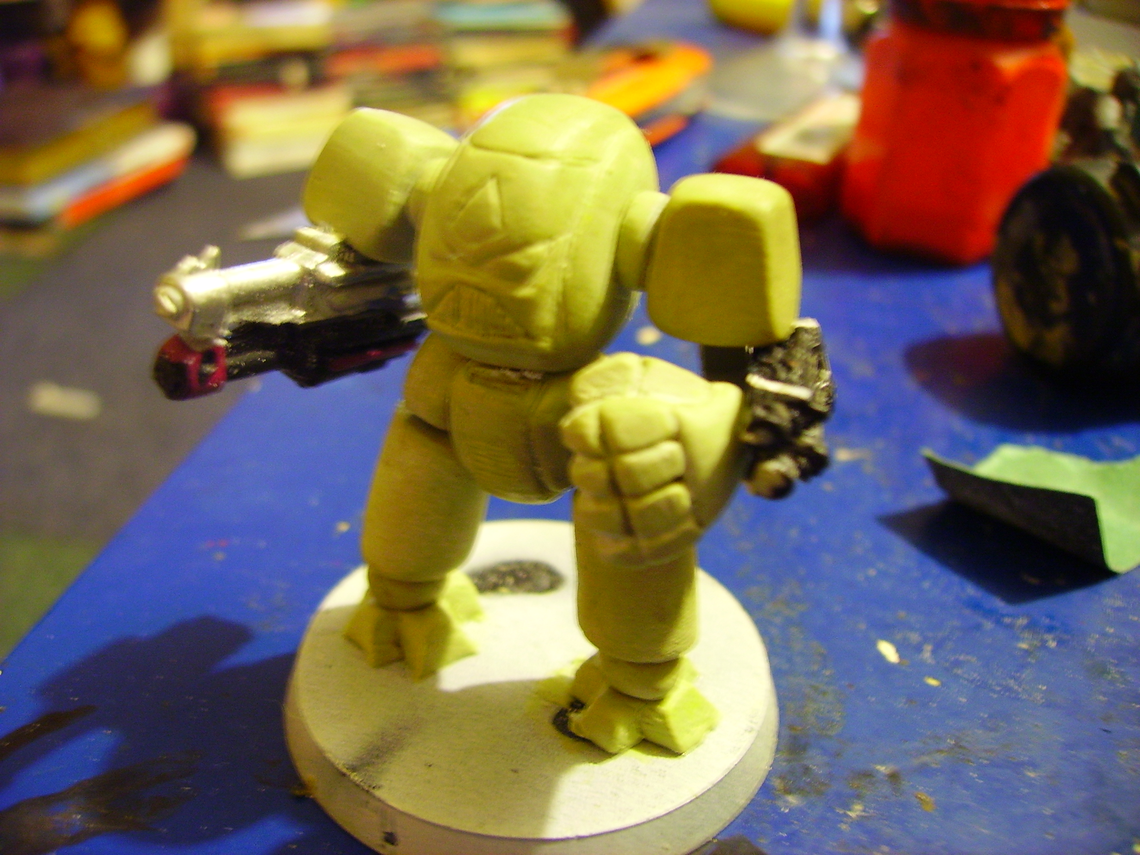 Not completely convinced by the legs yet, think the upper and lower parts of the leg need to be a bit more even in size, looks a little too orky at the moment to me, but then again, my mind is pretty much entrenched in Orkyness at the moment  Good job with the power fist, that looks cool, what sort of powerplant type thing are you thinking for the back?