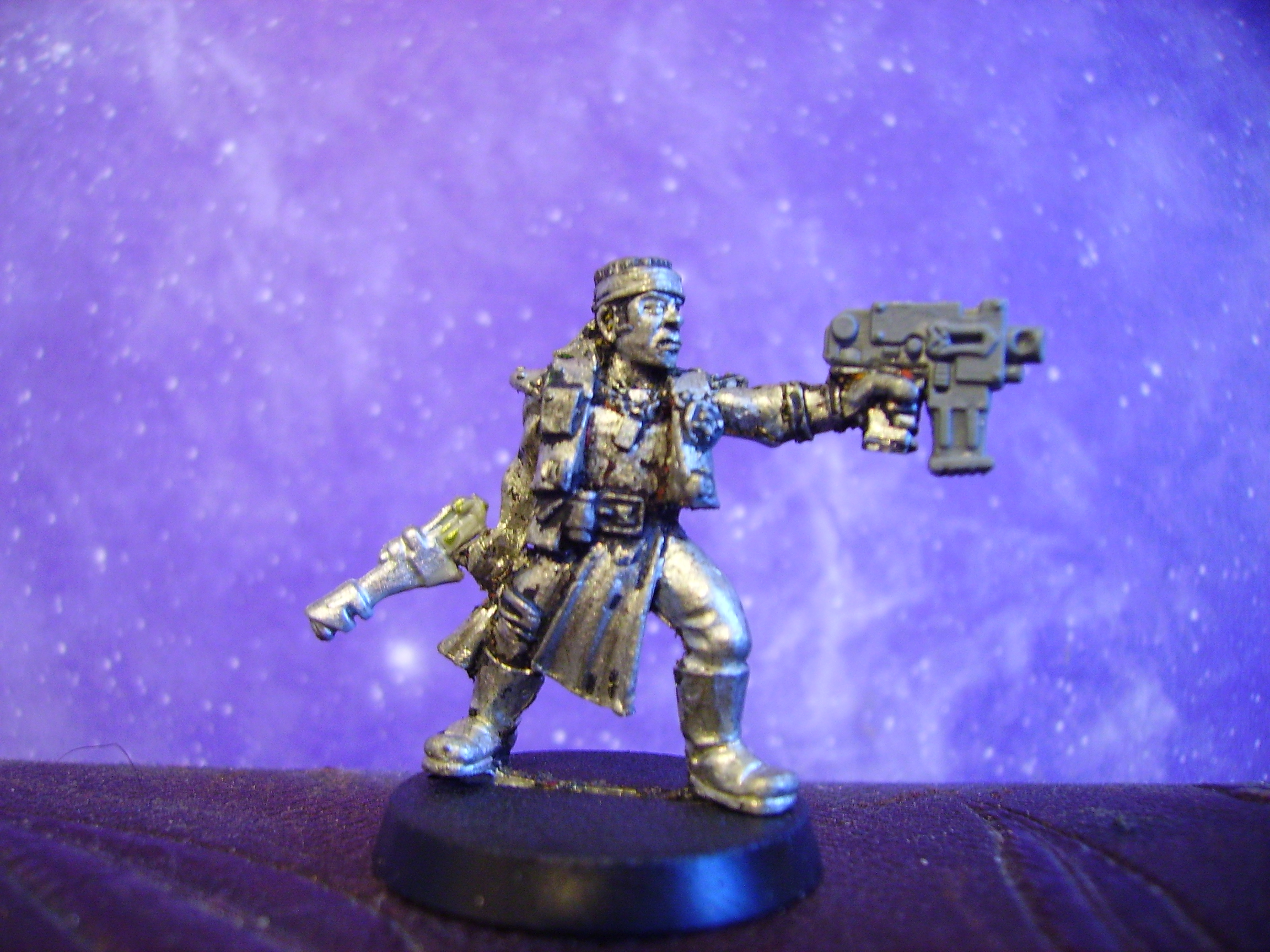 He really looks good... I like that mini, the hood adds the tiny "grimdark" touch for the 40k universe... Sorry I didn't notice this before, but... Could you drill the barrels out?