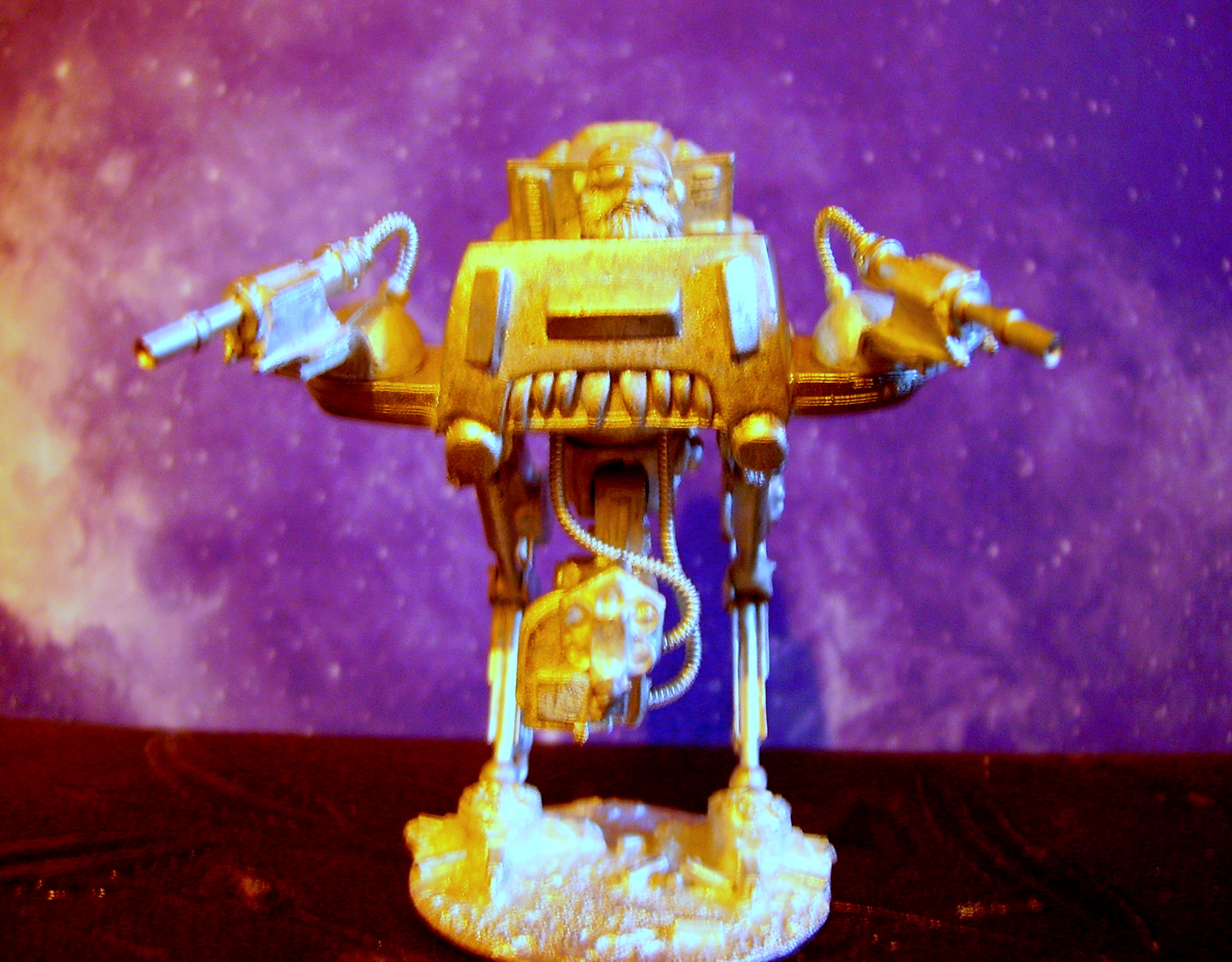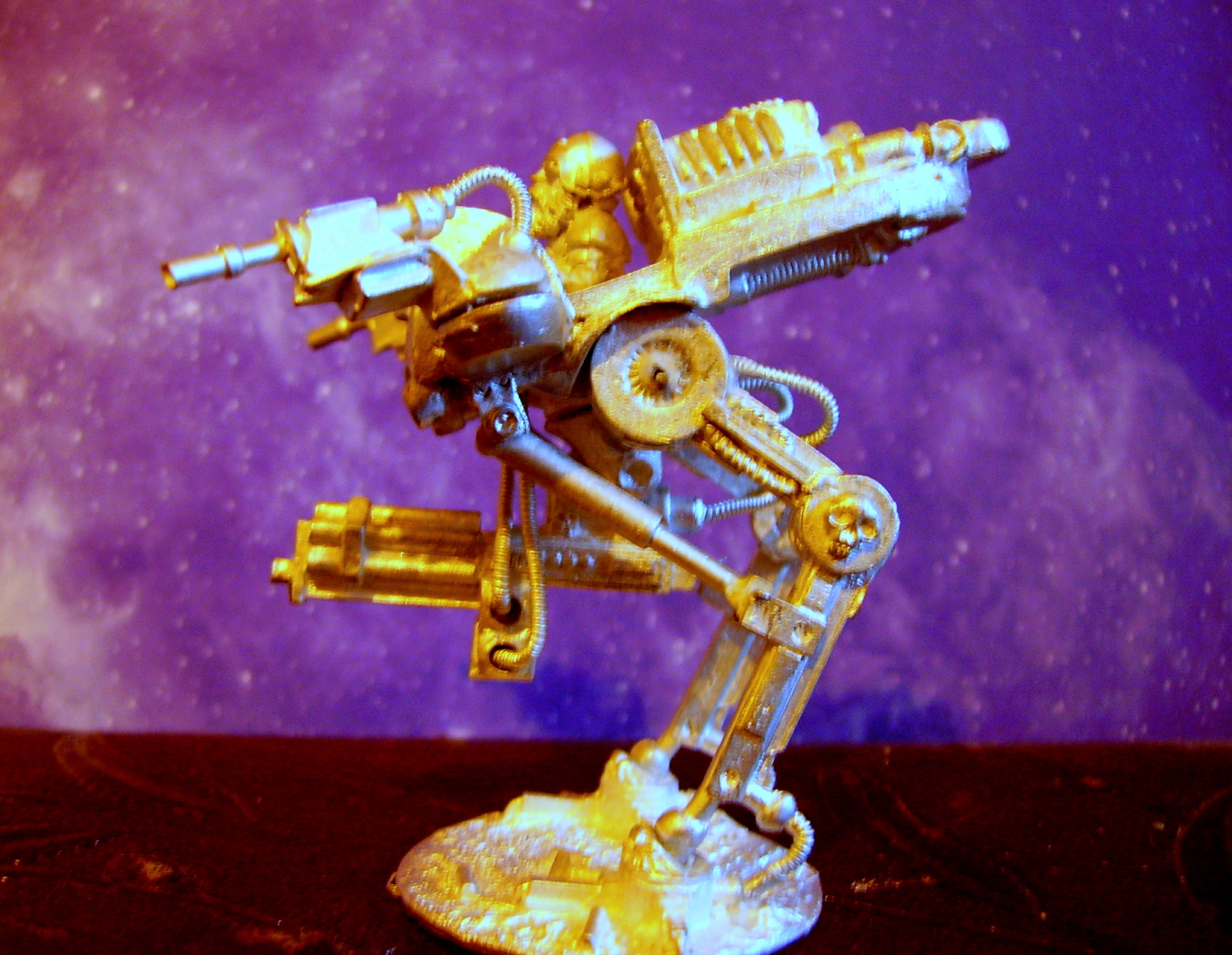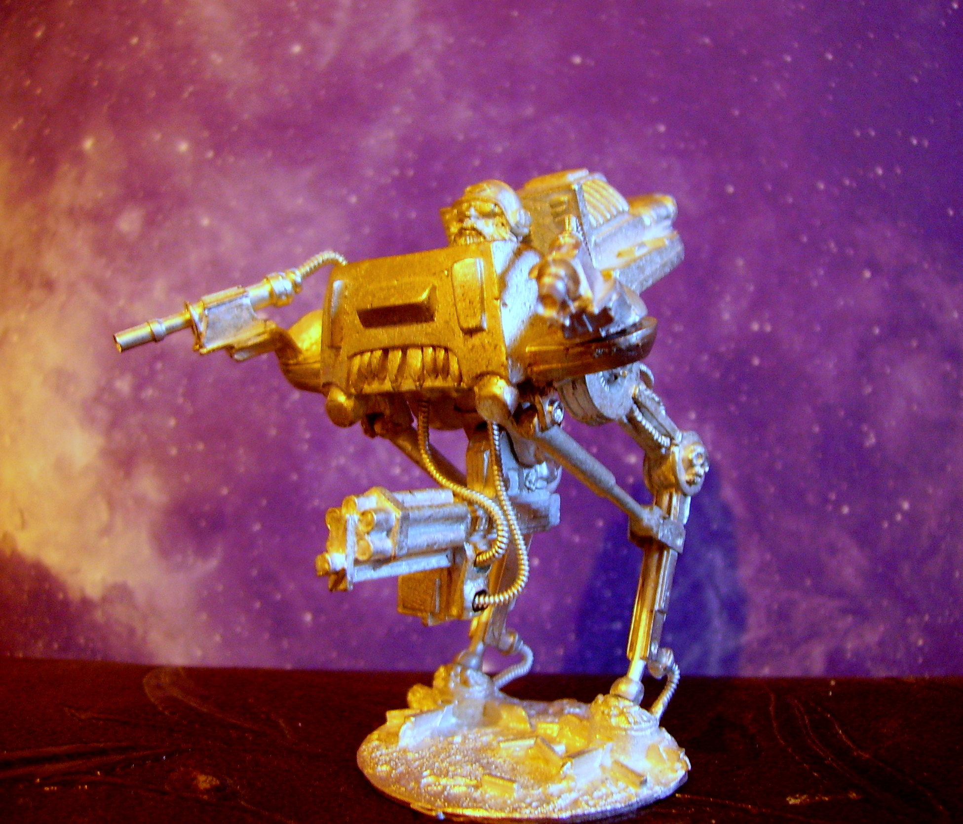 well heres an update - I've been fiddling around with his hood and started detailing the shoulderpads, darkened the gold, and warmed up the gun. Not much else got done. I will have to ponder what to do next tonight. Maybe he will be finished soon. I want to drill his barrels but my pin vice was cheap and now its broken - hopefully the replacemet will arrive tommorow.