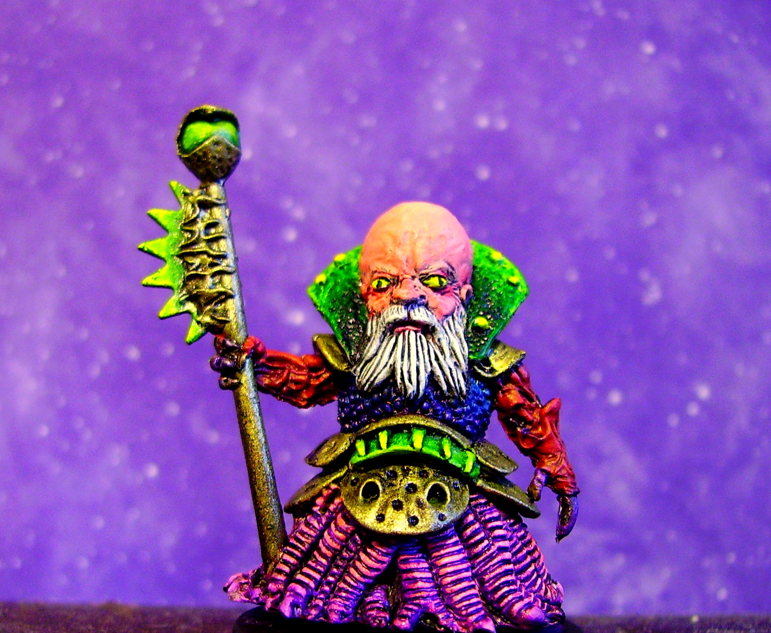 Well I've worked out all the basic colors, done a wash and started highlights. I'm not quite sure about him yet. I might have overdone the purple. What does anyone think about the colour scheme?