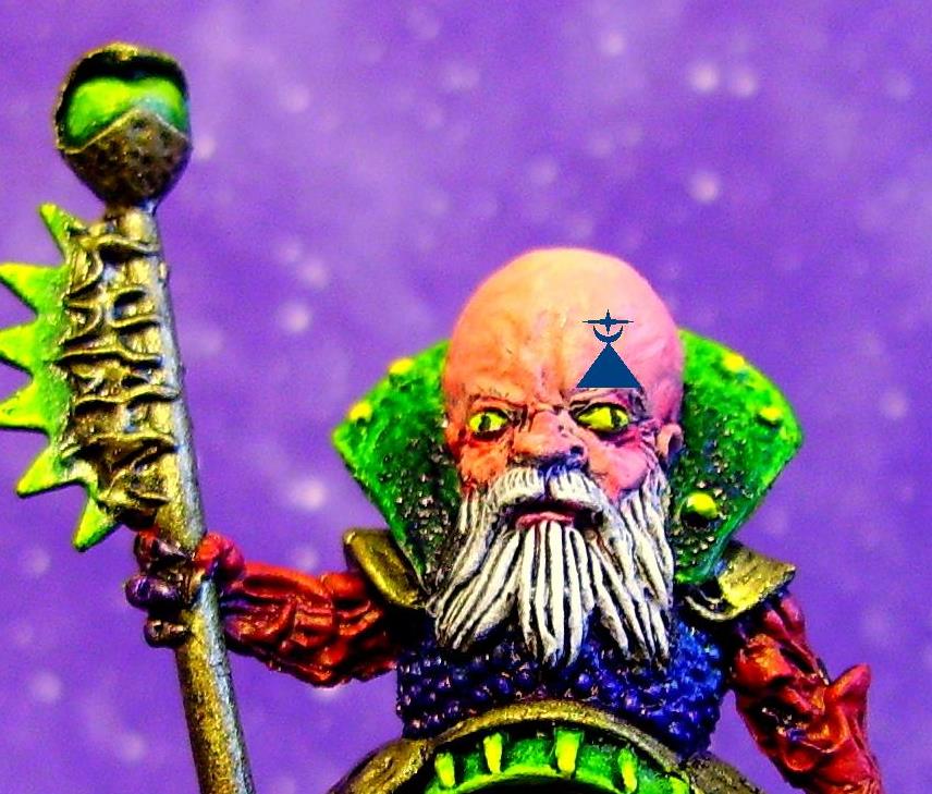 Center of the forehead, definitely. That guy's colors are awesome! Lovely detail on the face. Weird mini made awesome by a very awesome paint-job!