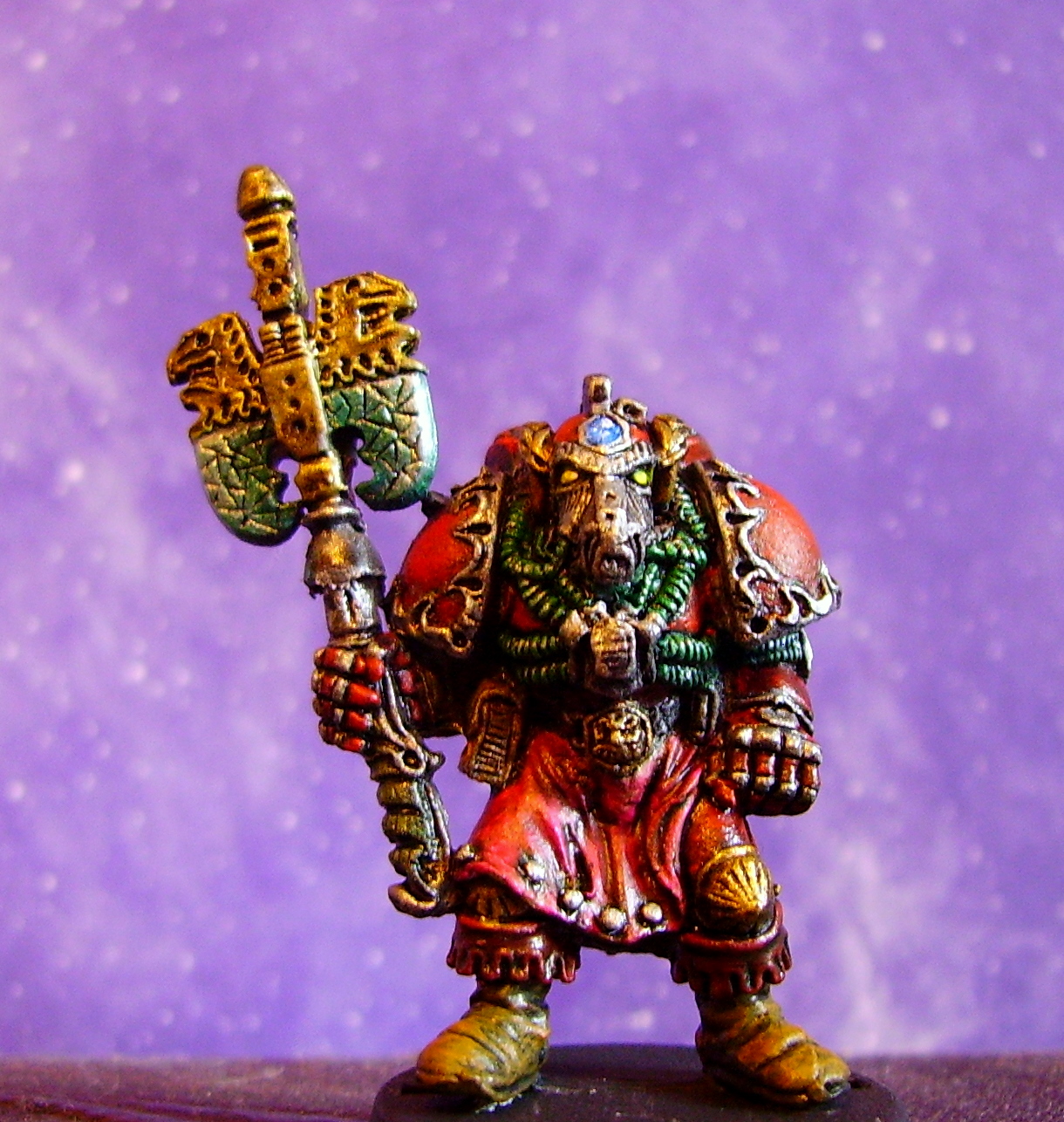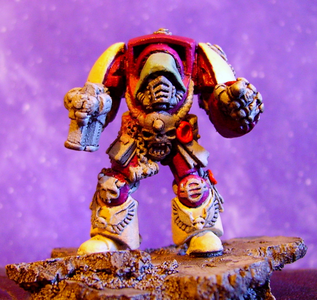 wow , that deep red is very mechanicus, he looks all corrupt and corrupting, with those baleful yellow eyes, sadly seeing , deeply staring , longing for his tortured bearings. Inky black with viscous fluids, draining through this soulful druid.Ponder logos of the maker, titan legions, Emperor breaker.
