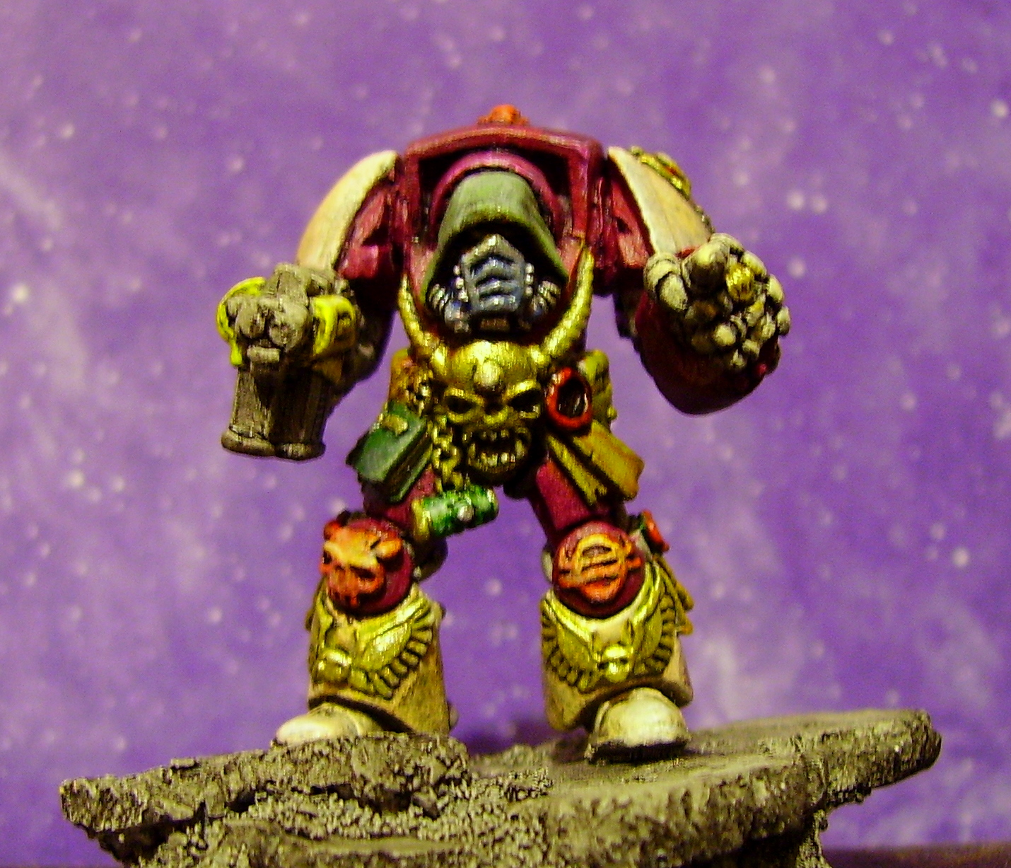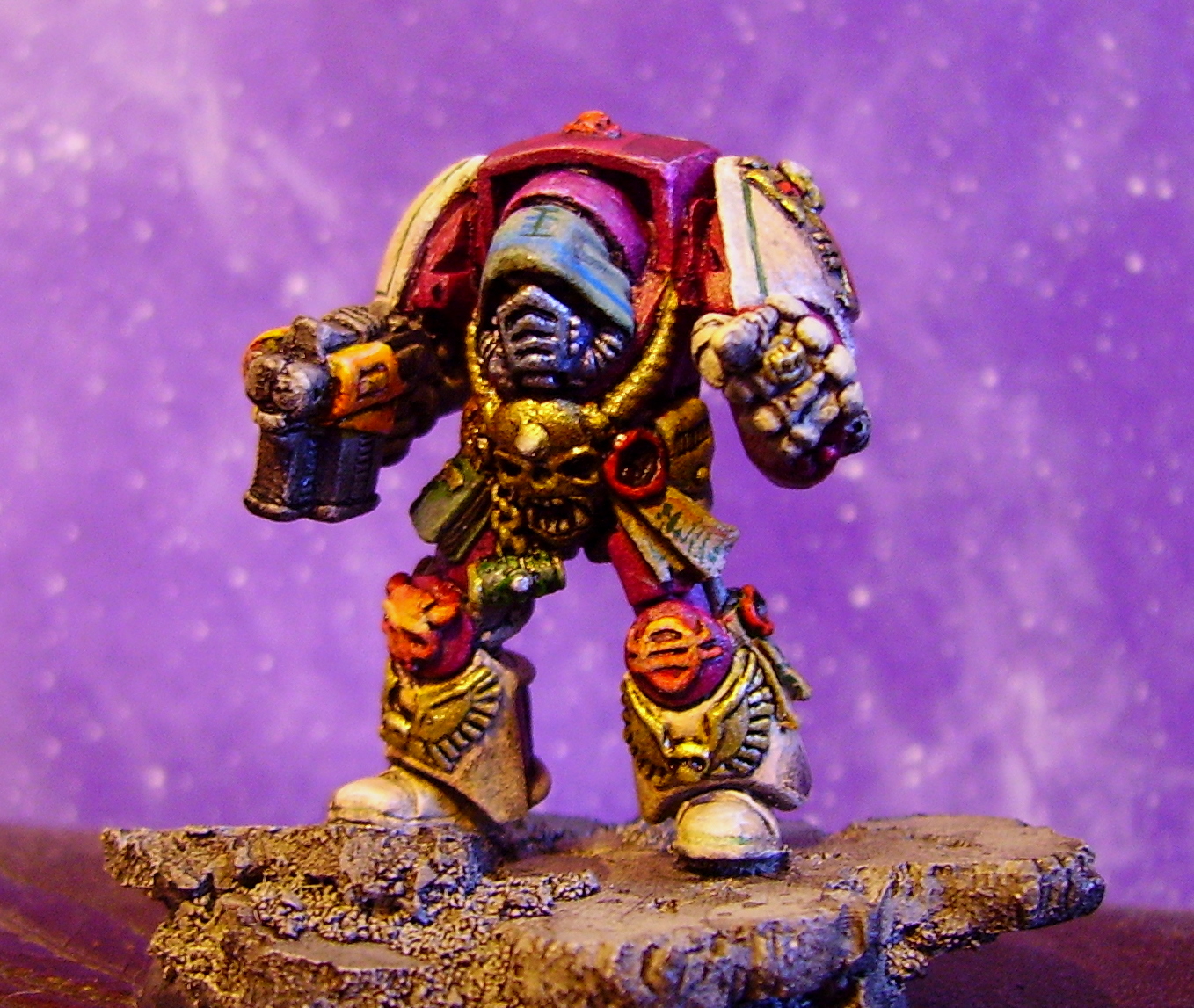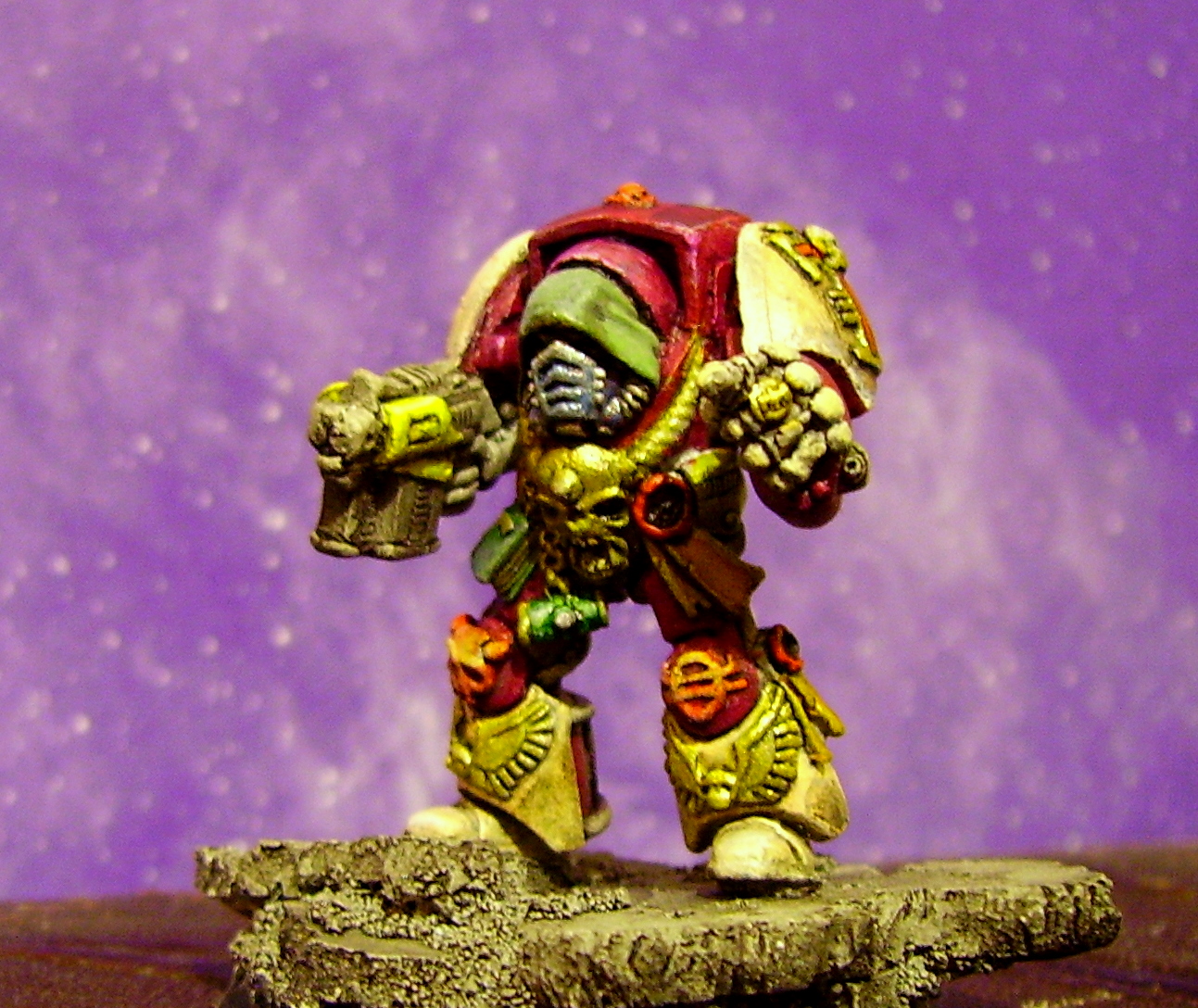 Well i like the colour scheme especially your red to yellow knee blending, thee green book and tube thing is a nice contrast to the purple, purity seal looks ACE! are you gonna put lettering on it. Not sold with the yellow on the strm bolter housing, looks a bit lemony at the moment, gold skull is very dramatic, but if your unsure about all the purple , i would change the light above his head to match his lower legs, and the inner metal hood that is purple to a more complimentary colour like the gold maybe, but since i hardly paint i am not the best for advice!! i like him though! and i am celebrating i just won 21 oldschool imperial army dudes plastic for my diaroma yay! sorry just a bit excited!! btw have you sobered up yet