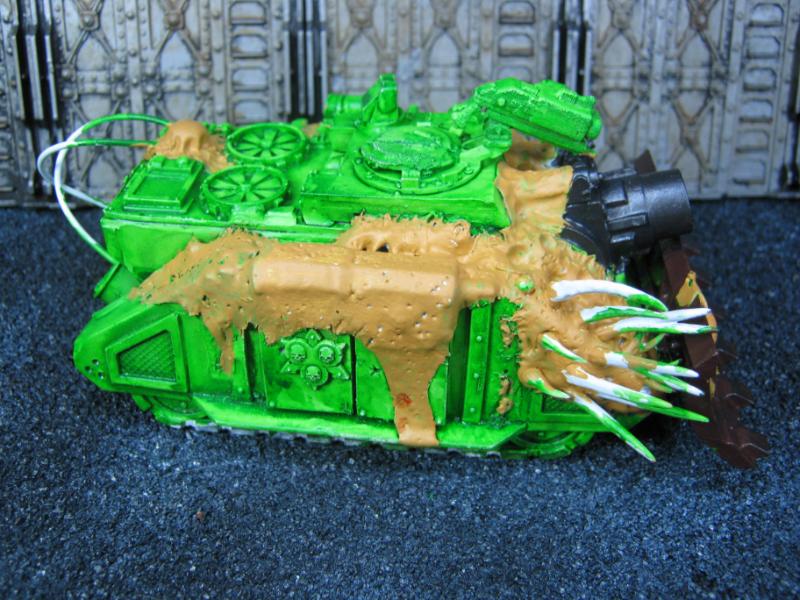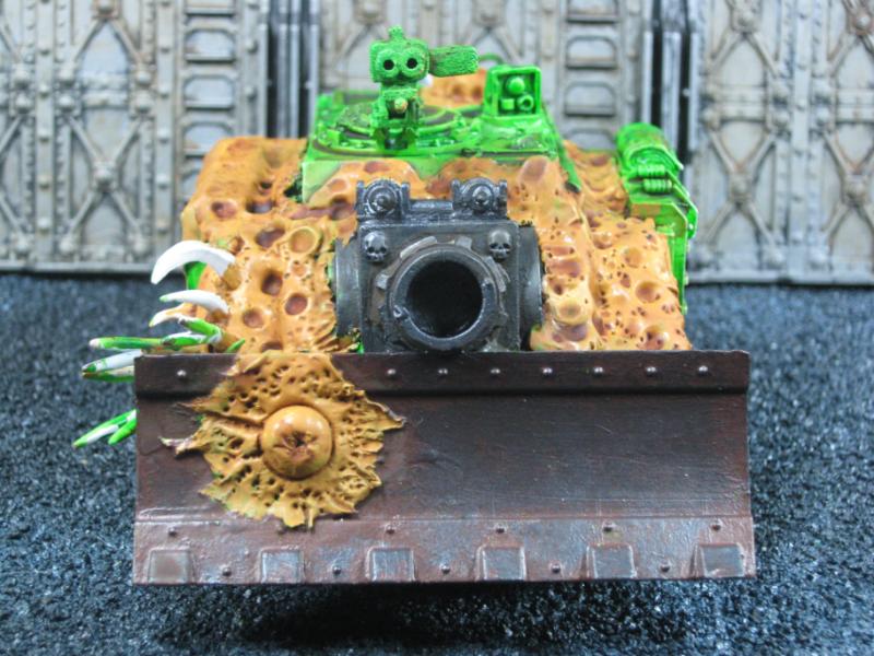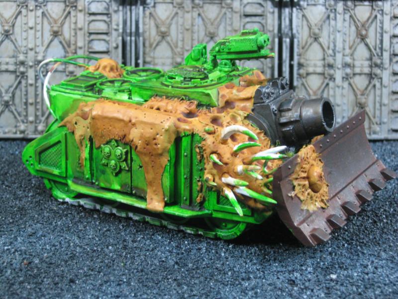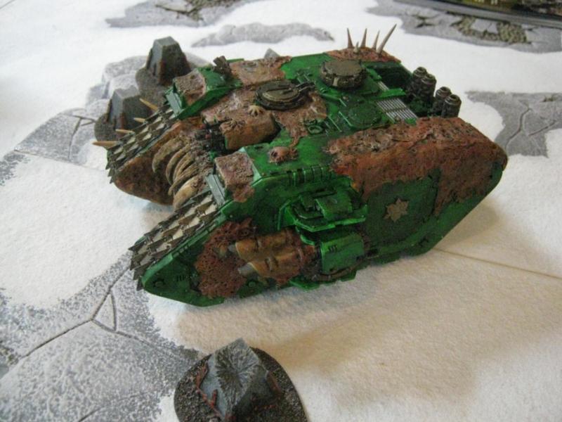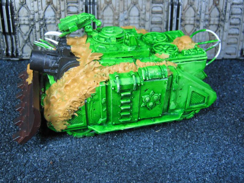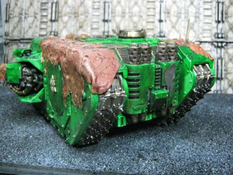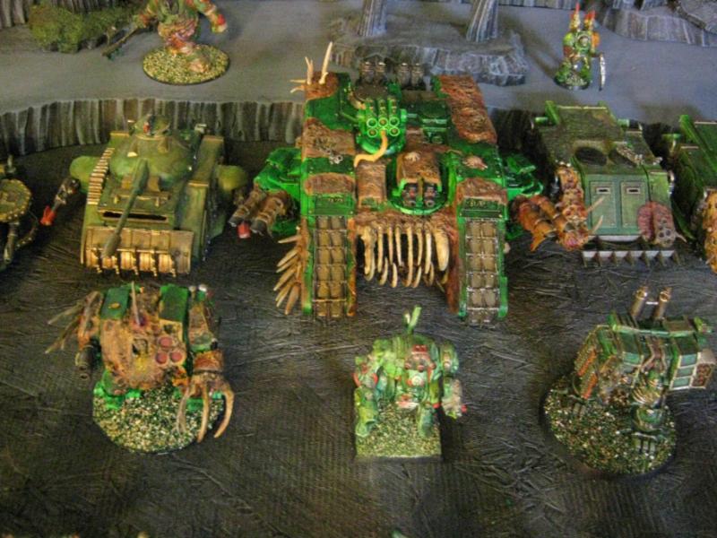Wow... The complete army shots look awesome. A glorious, menacing solute to the Great Lord of Decay. Skalk the way that you described the "venerated Death Guard Plague Marine encapsulated in a life-support system" was freakin awesome man. (Scared the crapola outa me). The three Land Raiders look great, covered in corruption and morbidity, can't wait to see what you do to the Vindicator. As always this thread is 100% value and has been blessed by Grandfather Nurgle's pestilential favour  Keep up the good work.