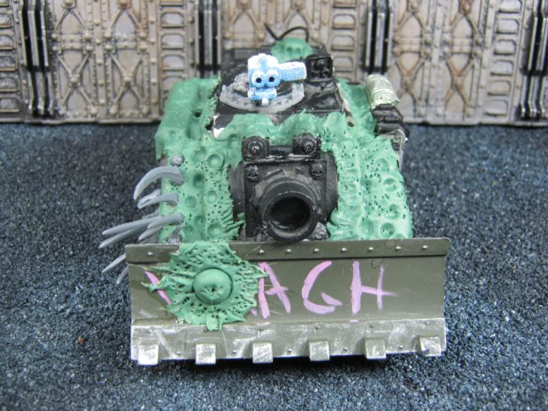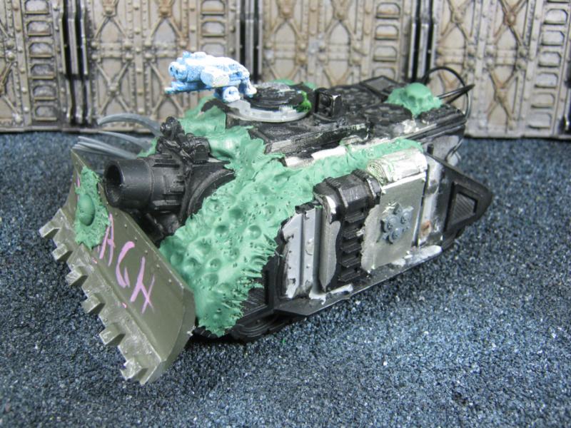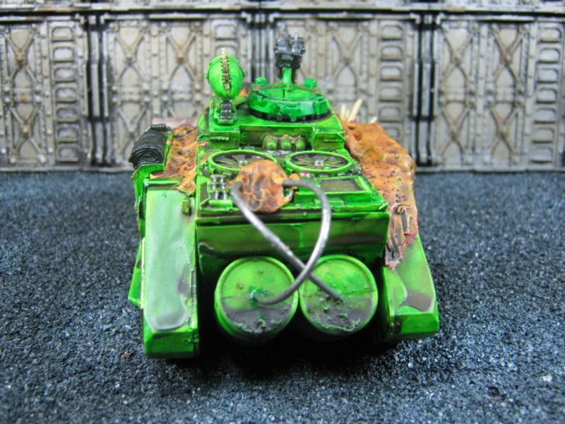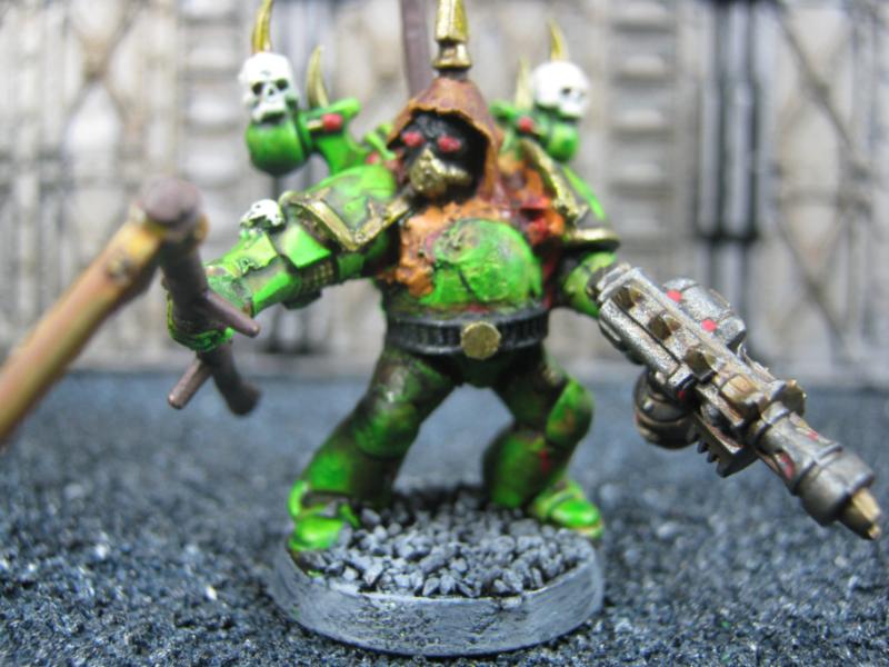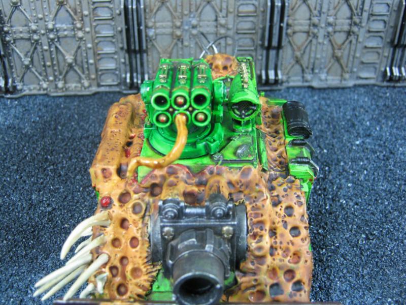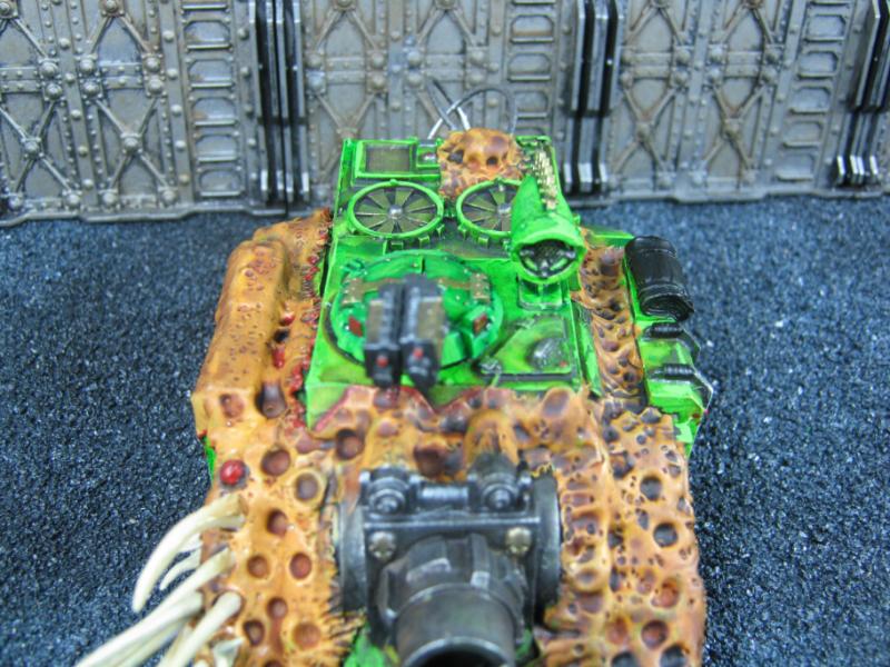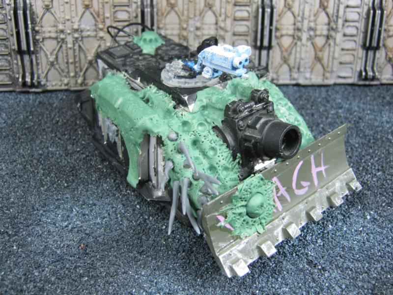 Wow... The complete army shots look awesome. A glorious, menacing solute to the Great Lord of Decay. Skalk the way that you described the "venerated Death Guard Plague Marine encapsulated in a life-support system" was freakin awesome man. (Scared the crapola outa me). The three Land Raiders look great, covered in corruption and morbidity, can't wait to see what you do to the Vindicator. As always this thread is 100% value and has been blessed by Grandfather Nurgle's pestilential favour  Keep up the good work.