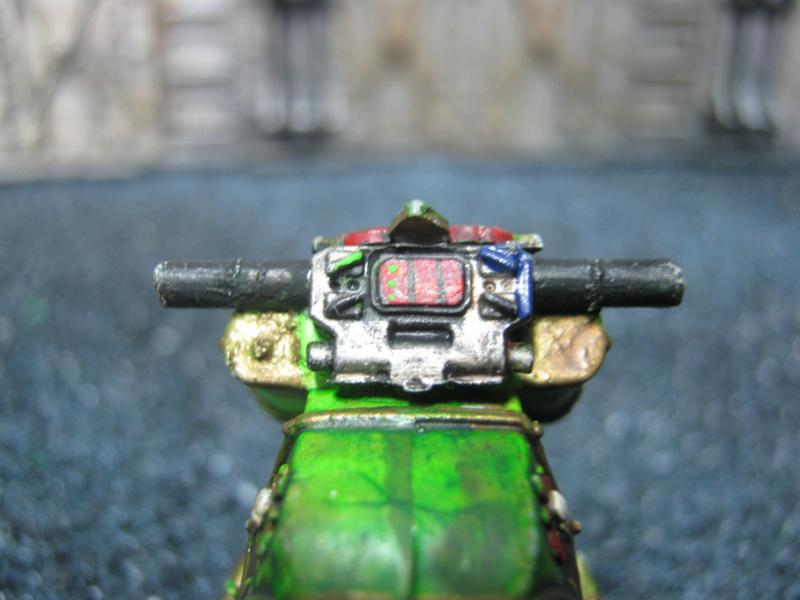 The handlebars / top front of the bike were misssing. I made the handlebars out of a wooden dowel, the "headlight" was replaced with an Icon of Nurgle, and check out what I did for the speedo / tach: