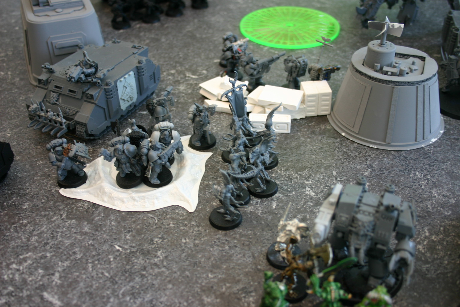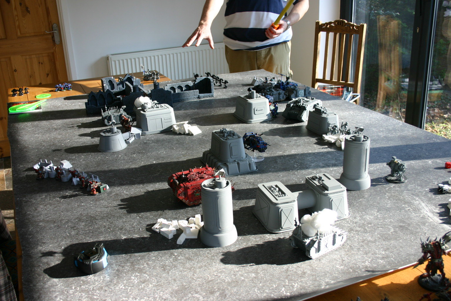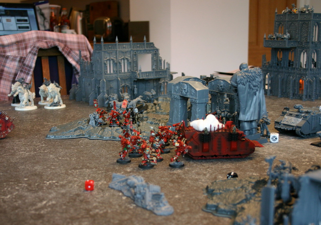 Battled at the weekend, sorry the pics aren't very good, but we had a good time. 2500pts of Space wolves and Crimson Fists vs CSM's and Daemons. They played it fairly cautious, I took my usual gung ho approach. I pushed up on the left flank but their jump infantry kept popping in and out and made short work of a squad of 5 chosen all armed with meltas. Sadly my Samurai Berkers were shot to pieces attempting to assault an objective deep in enemy territory, as their vindicators had cripppled the samurai's ride, they had to slog it on foot right into the jaws of the beast! I had a small squad holding onto an objective deep in my own half, which left the one in the middle of the table and the one on the left. Their dreadnought tied up my troops on the right, and a marauding landspeeder was knocking out stuff (inc my Landraider and deep striking soul grinder) in the middle. Deep striking all my bloodletters on the left flank resulted in contesting that objective . The real turning point arrived in the form of Uraka the warfiend. With the aid of my Daemon prince they made short work of a few terminators in the middle, Uraka then took out their Landraider and in the last turn the landspeeder. So we ended after turn 5 with one objective on the left being contested, them having one and me having two as I'd moved Berzerkers into the middle - victory was mine! - this time.