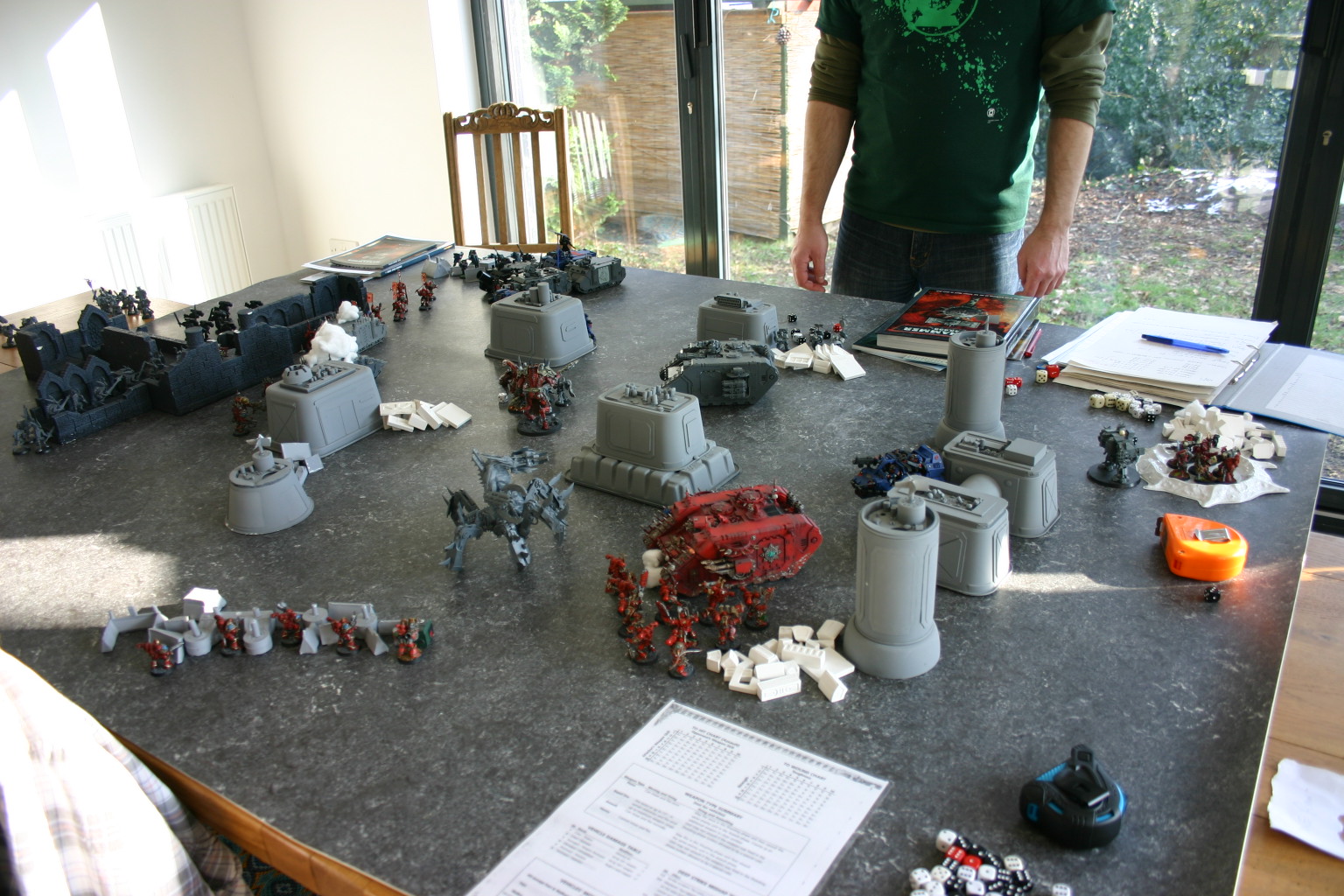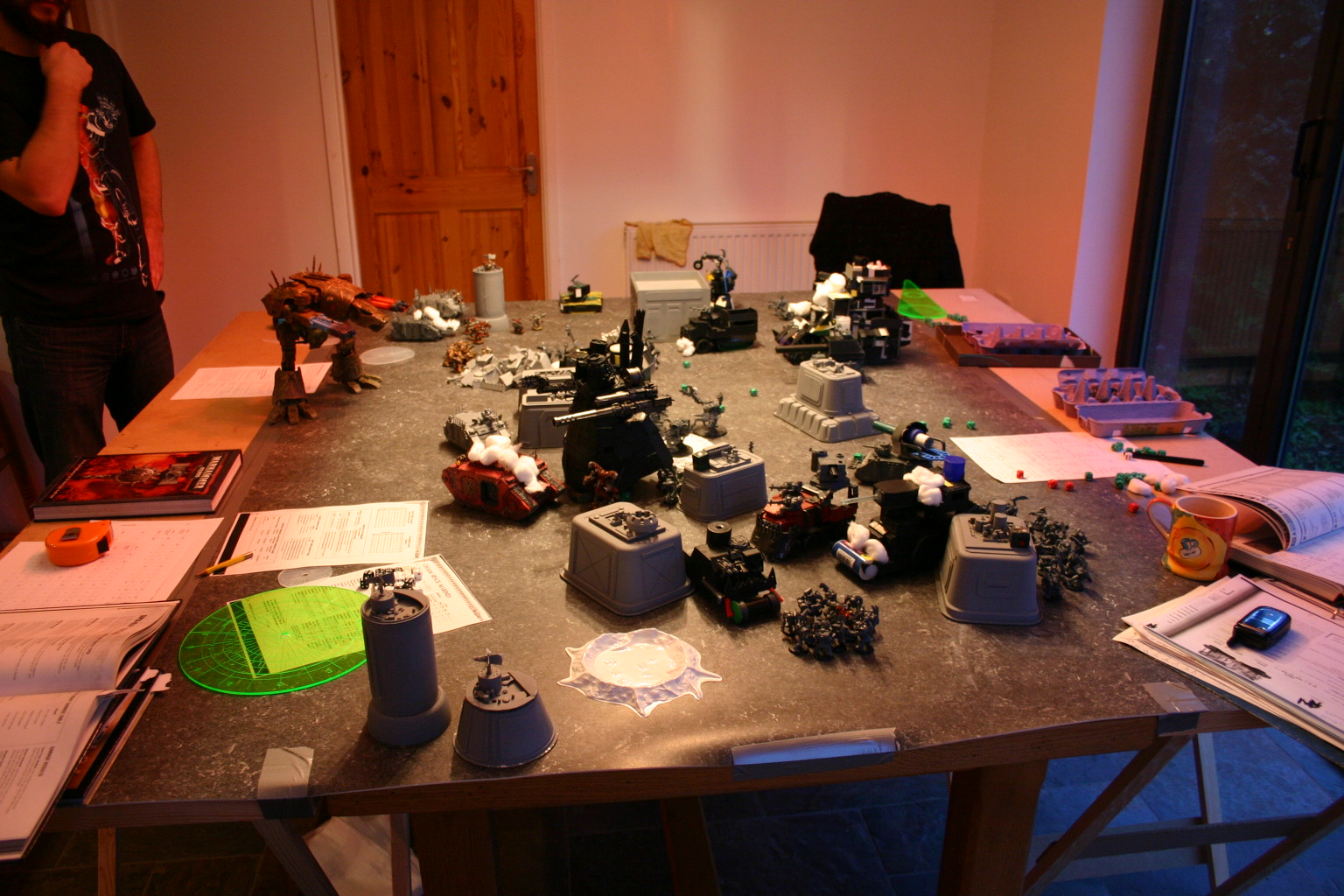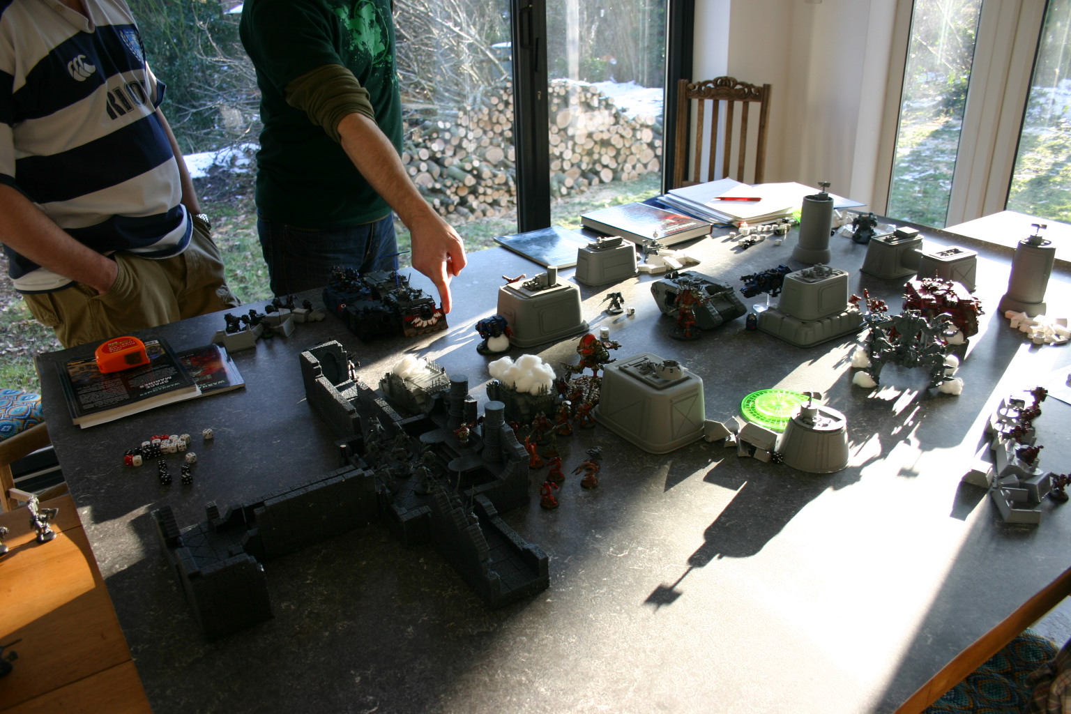 Battled at the weekend, sorry the pics aren't very good, but we had a good time. 2500pts of Space wolves and Crimson Fists vs CSM's and Daemons. They played it fairly cautious, I took my usual gung ho approach. I pushed up on the left flank but their jump infantry kept popping in and out and made short work of a squad of 5 chosen all armed with meltas. Sadly my Samurai Berkers were shot to pieces attempting to assault an objective deep in enemy territory, as their vindicators had cripppled the samurai's ride, they had to slog it on foot right into the jaws of the beast! I had a small squad holding onto an objective deep in my own half, which left the one in the middle of the table and the one on the left. Their dreadnought tied up my troops on the right, and a marauding landspeeder was knocking out stuff (inc my Landraider and deep striking soul grinder) in the middle. Deep striking all my bloodletters on the left flank resulted in contesting that objective . The real turning point arrived in the form of Uraka the warfiend. With the aid of my Daemon prince they made short work of a few terminators in the middle, Uraka then took out their Landraider and in the last turn the landspeeder. So we ended after turn 5 with one objective on the left being contested, them having one and me having two as I'd moved Berzerkers into the middle - victory was mine! - this time.
