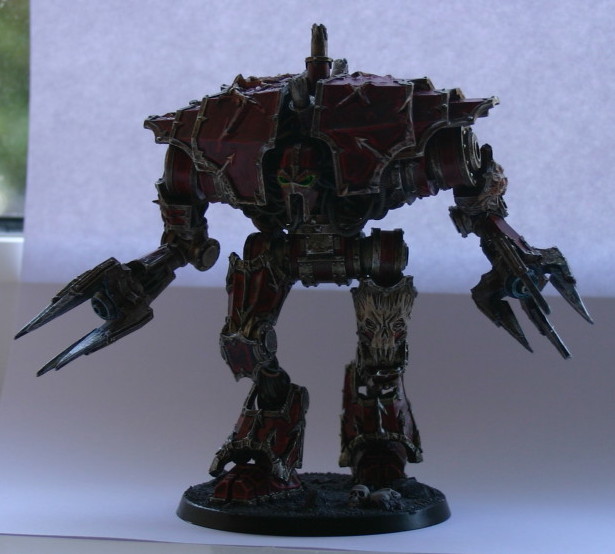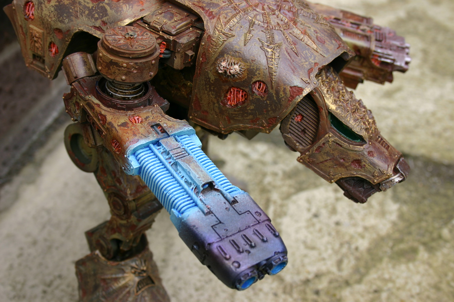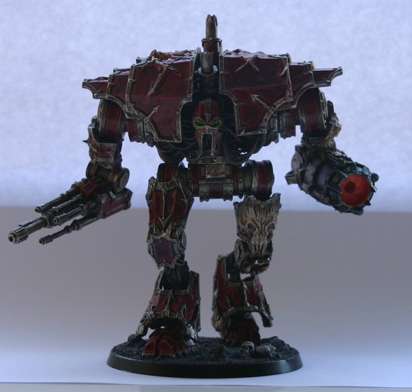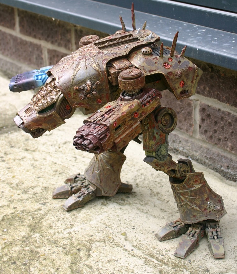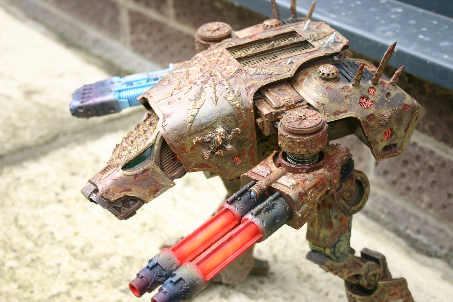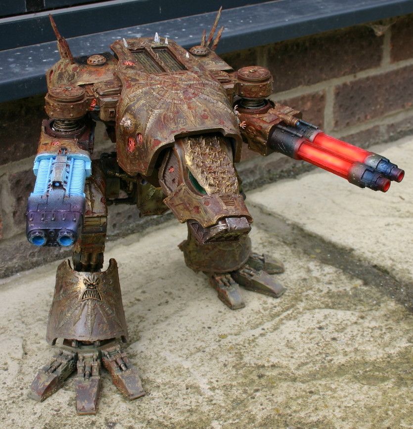 Thanks everyone. I've been thinking about what colour to paint Fluffy, Mrs monkeyh suggested afterburner fade (yellow through orange), I've seen a warhound done like this on Google images and it looks pretty good, but I was thinking something a bit more old and rusty looking. Any suggestions? The colour needs to fit in with both my Khorne and Nurgle armies but I don't want to specifically tie him to either one.