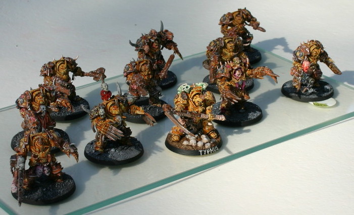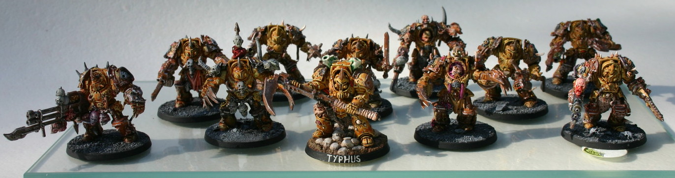 Yay! It has taken me over a year and a half to paint this unit of 10 Nurgle terminators! Here is the last one, and also here is Typhus with his 'honour guard' of terminators.
