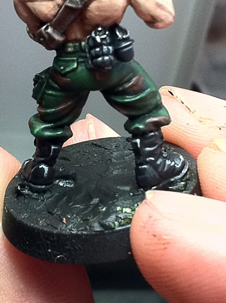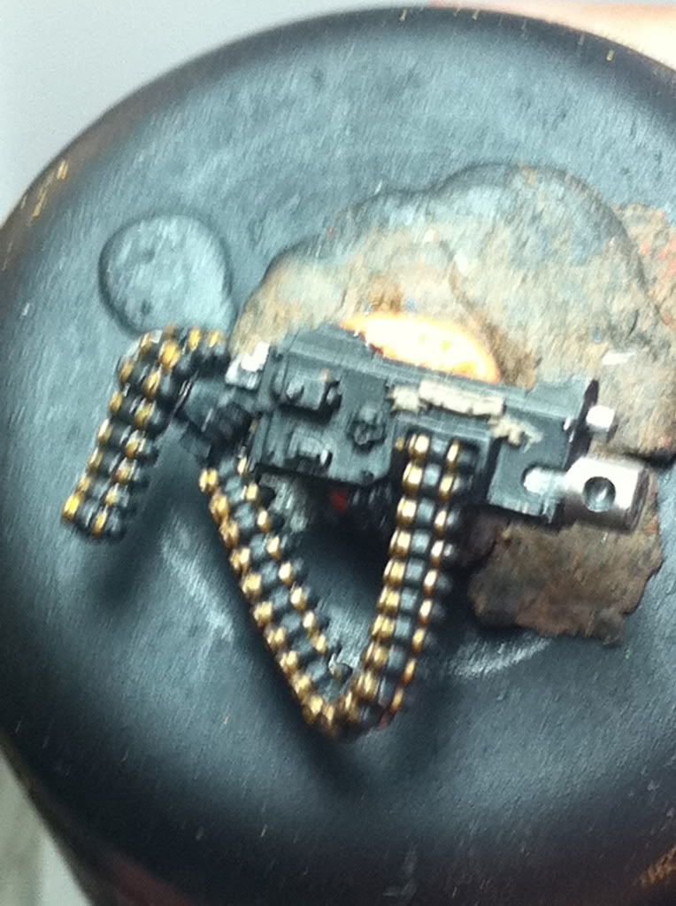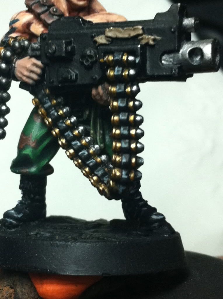 Ok so, well...the flower wasnt makin it. I knew in my mind when i put it on that even though i realllyyy wanted it...there simply wasnt room and its placement was too close to his leg. Essentially there was too much green right there. It just looked funny, I cant explain it. But. I chopped it off. :( Sorry. But i think its best for the mini. I finished up the boots. Maybe a couple touch ups here and there. The grenades are also basically done. And ive begun work on the hard part. The gun. the bullet feed especially. This took about an hour, to base coat the shells which are brass. Steingass asked me a while back how i do brass shells, and i wasnt sure. But heres my mixes. Burnished gold 75% + 25% Snakebite leather. There here i wash with devlan mud. I dont want the color to get too orangish...ill pick out details with straight burnished gold. then mithril silver to that mix.