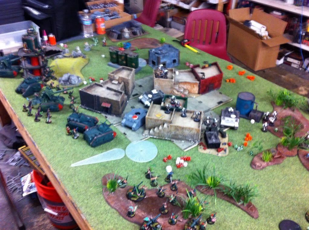 Hmmmm well i guess you guys will just have to head over to the competition thread to follow up on the tundric cadian cause this thread, is all about the jungle. LOL for now That first jungle conscript looks like junk. Strike 1. Ill try another idea...Since my wip sections are in full swing, and there is no need to draw out interest by withholding pics of finished work, i thought id finally, oh yes, finally, post a full army pic. And one pic under it, is of me getting my kicked by a Grey Knight army. I swear to god, the only way to beat these guys is to bring ONLY infantry...>_< I cant stand GK's. Looks, models, and rules. Anyways, heres the full, so far, Catachan 913th. If theres anything you wanna see up close, just let me know THE COMPLETE 913TH AS OF 10/12/11