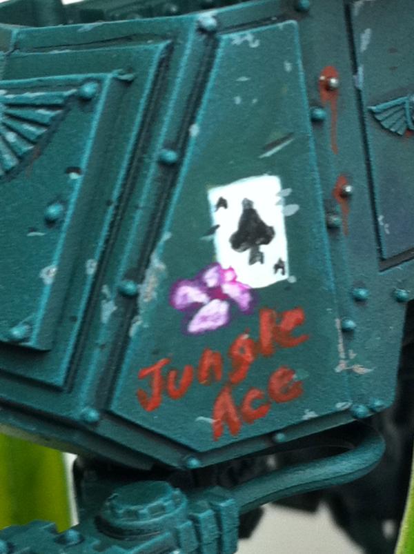 The Jungle Aces icon looks great. I'm liking the paint and basing on the two guys as well. One thing on the bases. I like the use of GS to stick the planty bits, but you could sculpt some roots or a small trunkish bit to lend to the plants themselves. As it is, the pink thing looks somewhat like it's being belched up by some mud. I don't think it would read that way on the table, however. I imagine it looks great on a table, and I like the over all effect.