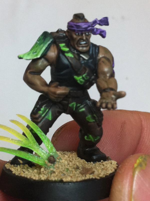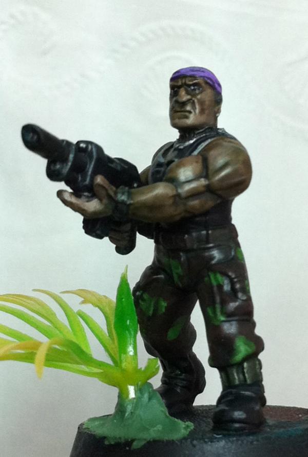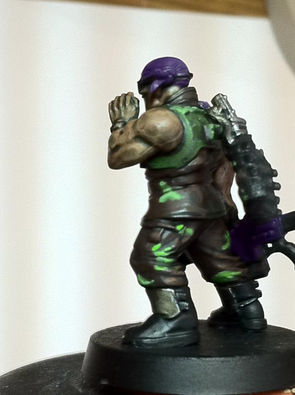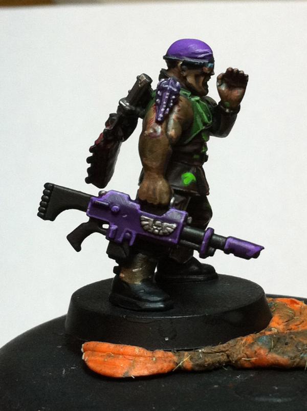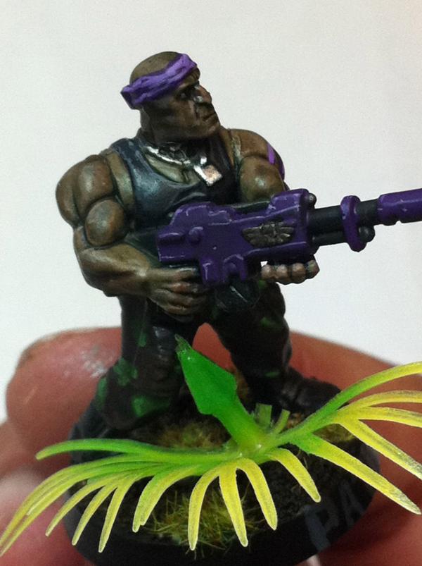 hmmm... purple...yeah see that this pot can be a thing that urges you on to use it... i have some colors i want to use but i still haven´t found a way to use them on...so the tad of purple is something i think can add some depth to your already deep^^ catachans... what i am currently not too sold is the kind of camo...there is something lacking there...maybe the main color of the pants a bit brighter and overall not so much glossy looking...dunno... maybe i am wrong completly here...