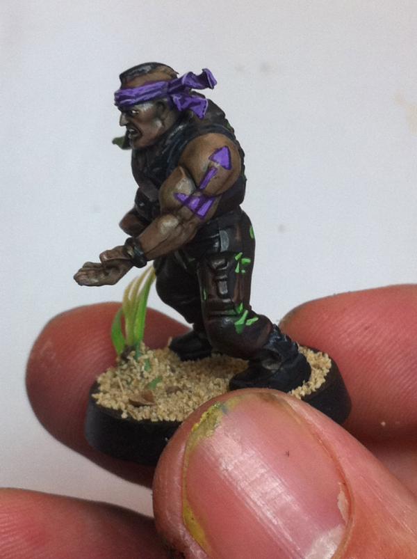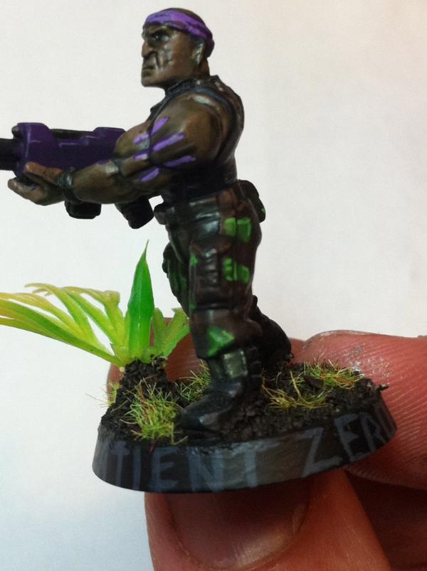 the purple guy, your pat(i)ent zero looks very good... i like the fine highlights on his gun...if you say there is no room for stripes i trust you in this^^ and i think since you have made the flesh look consderate darker i think he looks like a very good composition. now the camo idea really flies!