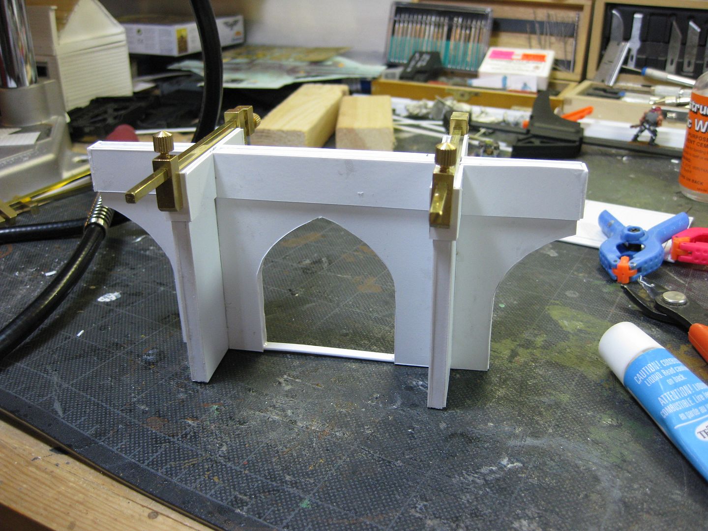 Then used the template to trace it onto the plasticard (flipping it over for the other half 3" high and 1 1/2" wide for a full arch. As for cutting, just gently follow the line with your exacto...NEVER try cutting through the plasticard, just gently score 2-4 times then snap the styrene, any rough edges can be cleaned up with the knife or sandpaper.