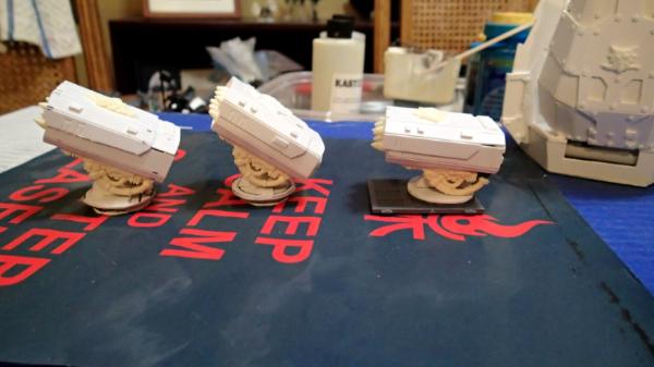 I also did some work on the Whirlwind turrets, getting the cable bits finished and starting on the mounts. I have a bit of patching to do and some detailing, but they're wraping up as well.
