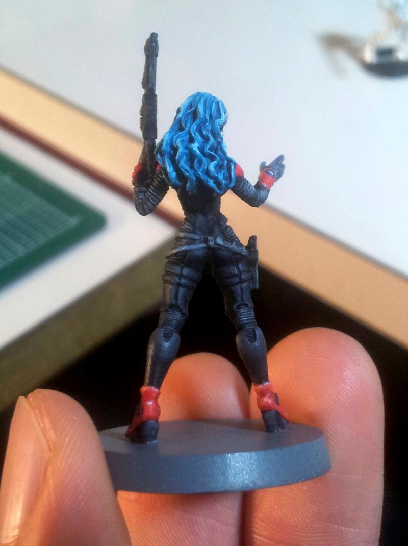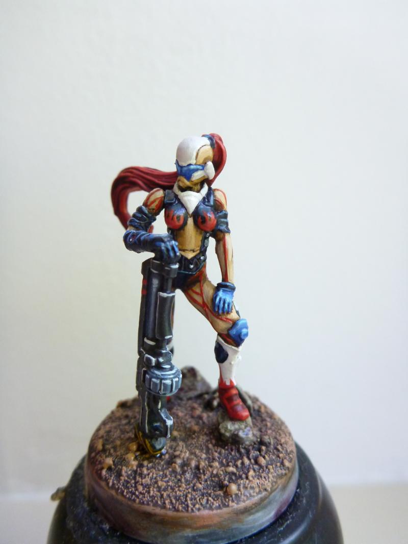 This one gave me particular problems. For one, the spider veins on the legs. I just can't paint them. They're wonky. Second was the hair. I really wanted to practice my Symbiont Armour technique on something like this, and I think the orange came out really nicely. But It also came out too bright for this model. I decided to keep it, as a model to stand with my Hawwa Snipers bright pink hair.