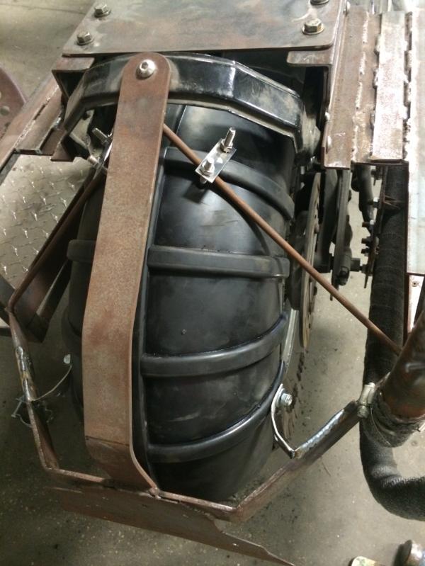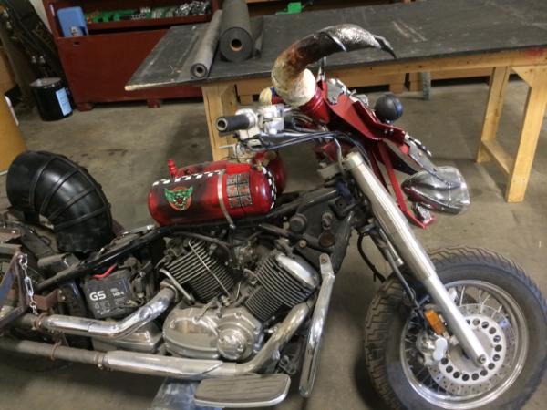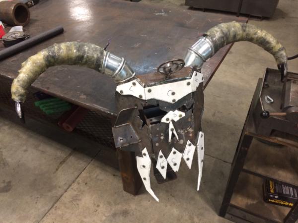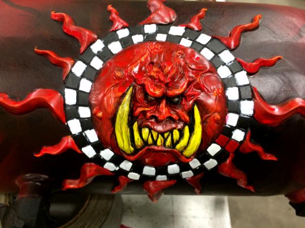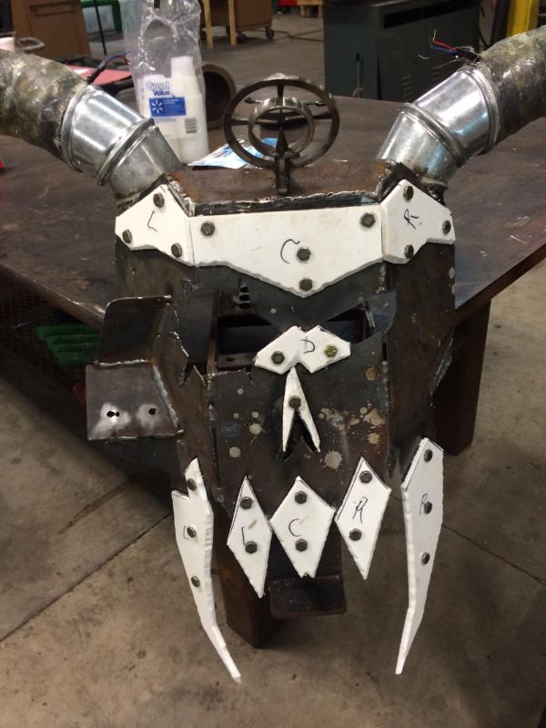 Automatically Appended Next Post: Once the aging was done, I took it out on several cautious test drives. First up the headlight was too close to the front wheel, so I raised it up quite a bit. Second, the Iron gob on the front was too bouncy, so I shored it up with a few bars of angle iron. Lastly I finished the cow hide as to water proof it better. I also took the aging down a hair, some of the Ork markings were too obscured. I also Added the Ork mouth to the right side.