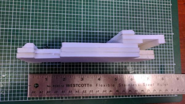 However with no internal reinforcement, the boxes are a bit flimsy and "squish" if you aren't gentle with them. Terrain usually needs to be able to withstand a little punishment, so another way to go is to fill the inside of the box with something sturdy. You could use crumpled up news paper, or if you're willing to spend a little cash, try foam board. I get sheets of this from the $1 store, which is pretty darn cheap. Here I have traced my template and created a stack of four pieces of foam board: