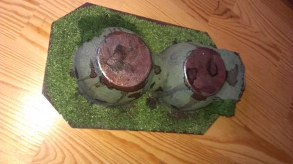 The confetti launchers are a fantastic piece and they do scream "missile launcher". The packaging is a good overall shape for a small bunker-like building. I'm in two minds about covering them in plaster. On the one hand, you have created a nice concrete texture. But on the other hand, you have covered (and softened) the shape of one of your "items". A couple of alternatives would have been to not add the plaster, but still use the sand (I'm assuming sand was used to make the texture) on the bare plastic. This would have maintained the sharper shape of the item but still added the texture for concrete. Or, added strips of plastic (or card) onto the bare plastic shape and made it a "ribbed" metal bunker with lots of rivets.