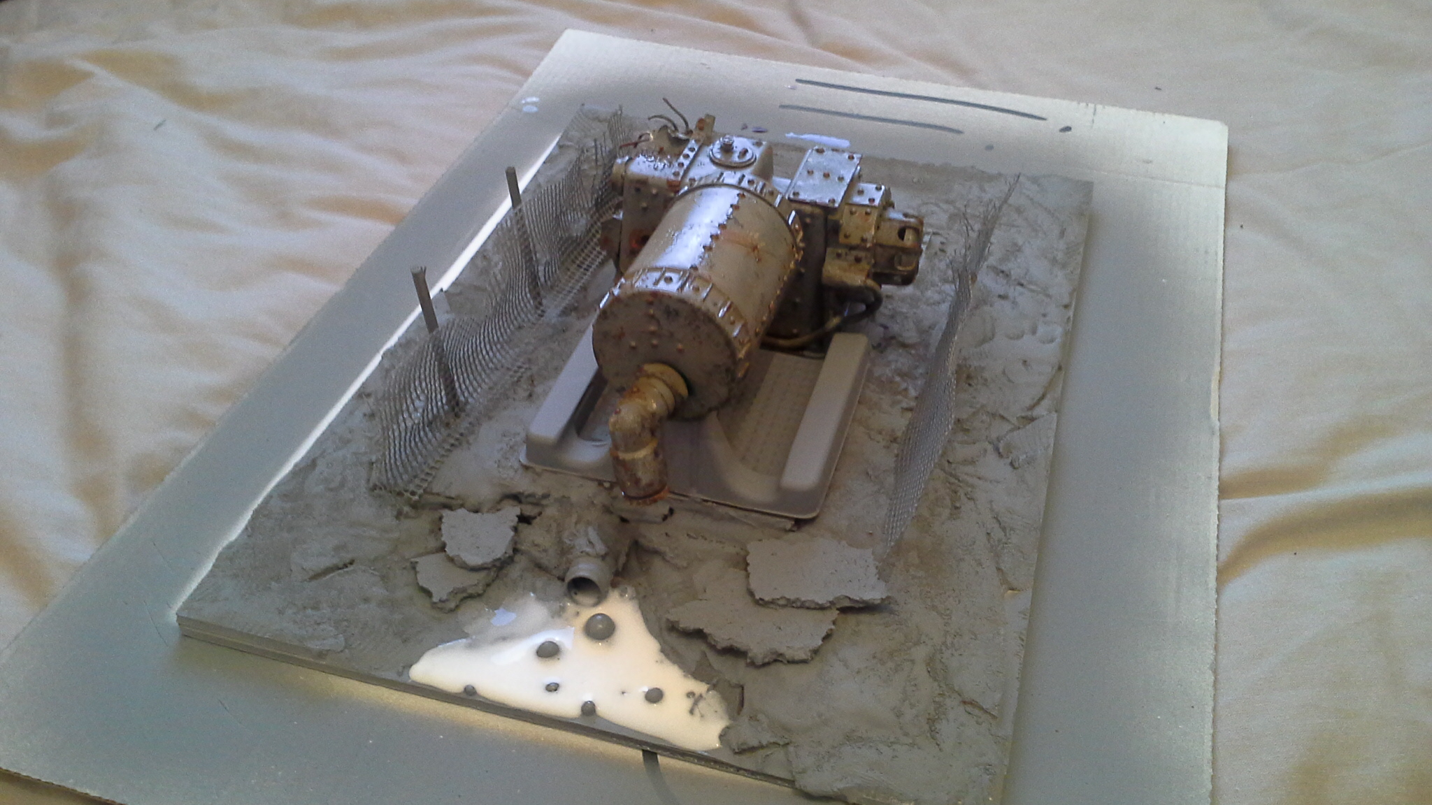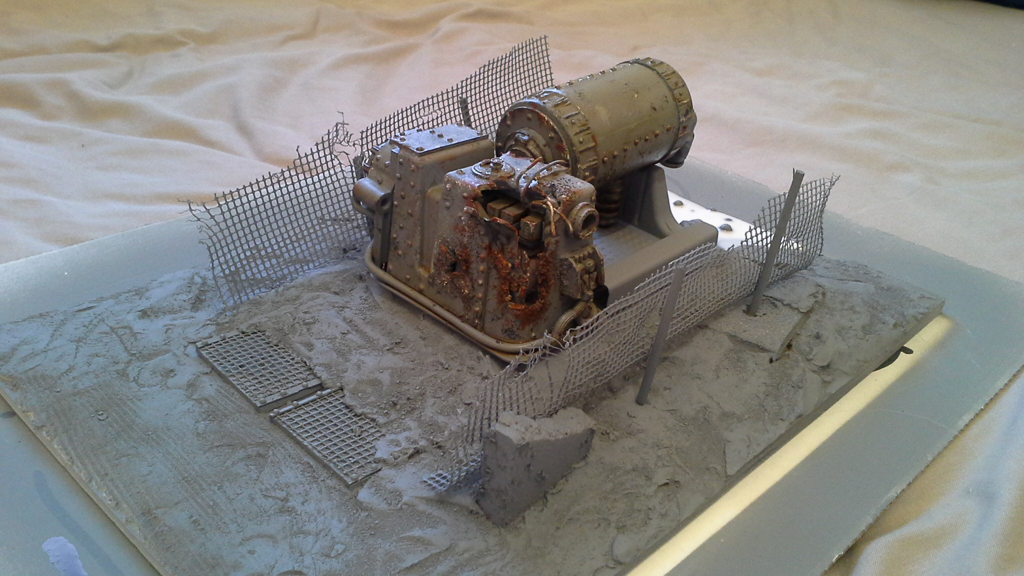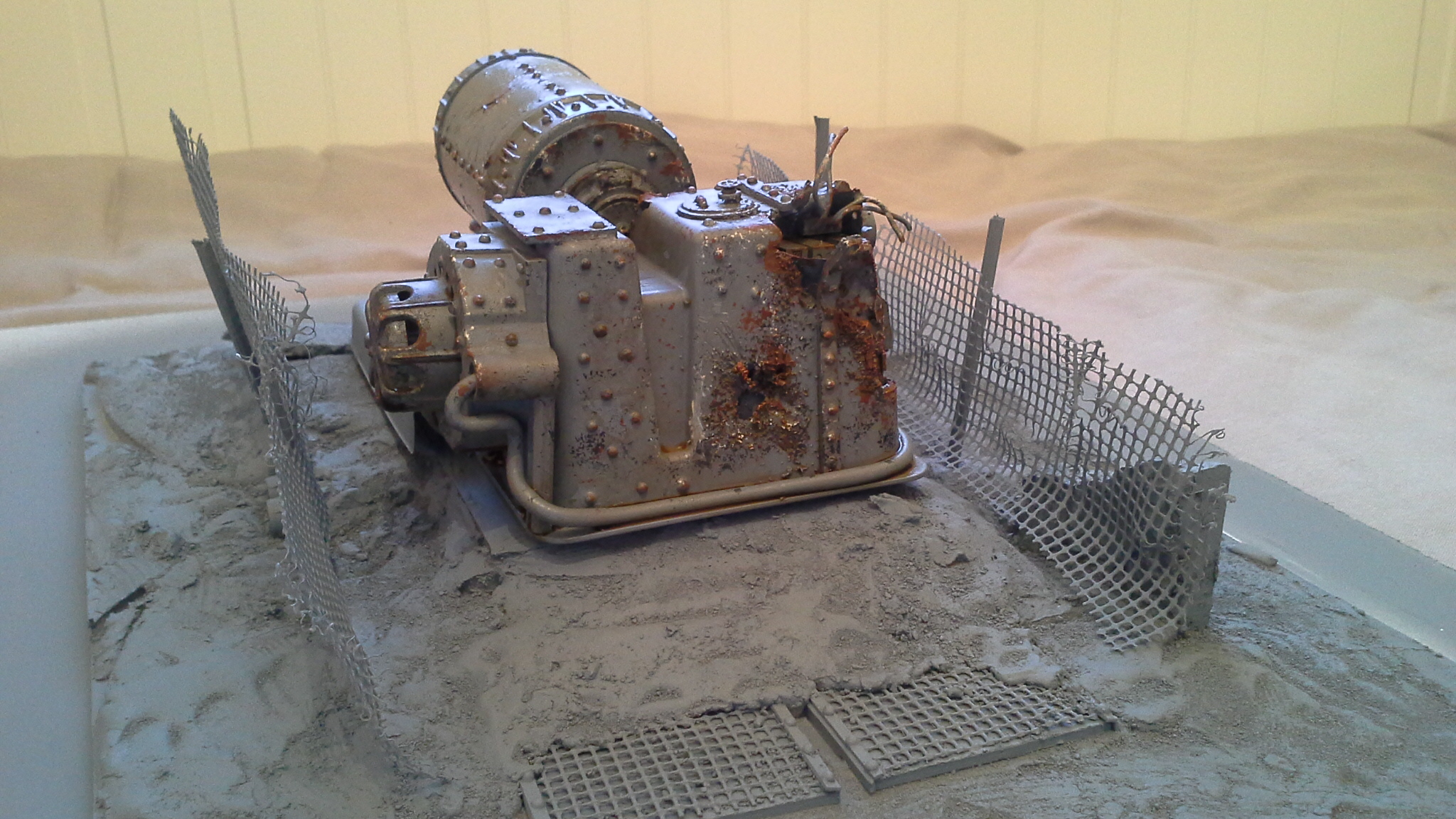 Both items have been transformed perfectly into scale. The added gubbins (and plentiful riviting) give a sense of purpose and scale. I like that you added bits inside the damaged part, although I may have removed one of those "cubes" as a source of the apparent explosion. The control console / electrical box thing (near the damage) could have had dials and buttons painted on instead of being just metal, and the wires coming out the bottom of that could have been given some colour.