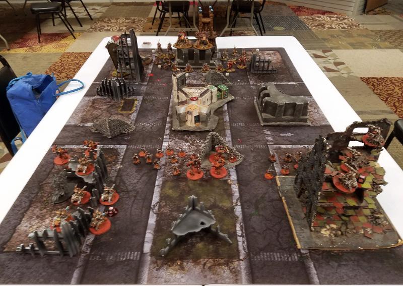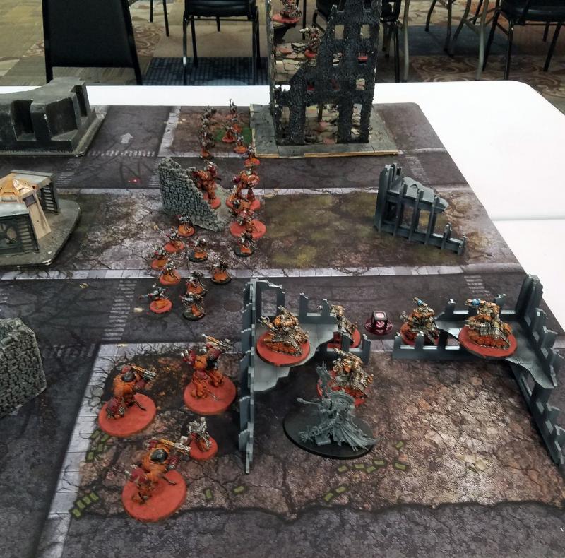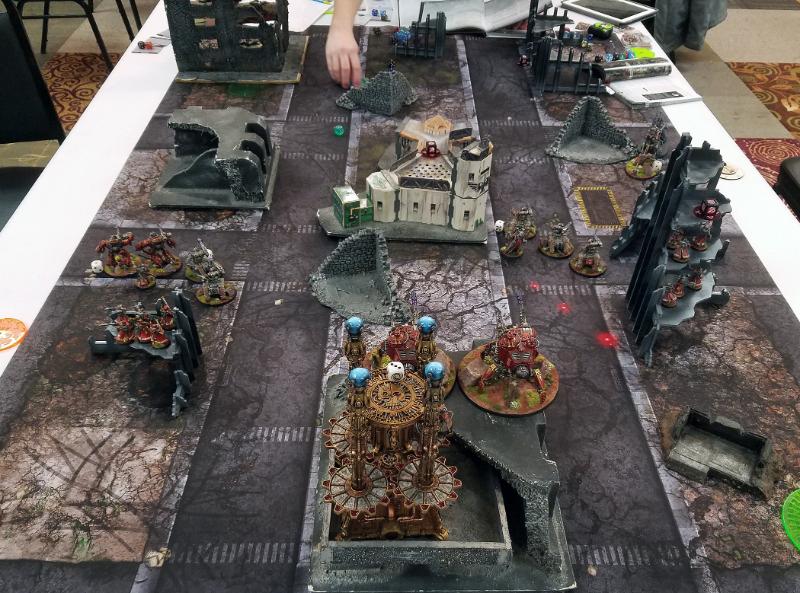 I think my army was a bit "harder" than it should have been given the emphasis on fluffy lists for this tournament... unfortunately when you set out to build a war convocation... you're pretty much left with nasty units. I don't have any priests or anything like that, and my army (with no SH's allowed in this tournament) is actually pretty shy on points so getting to 1650 was a challenge, hence the VSG. The only other odd thing was that due to the build restrictions & the fact that this army is split into two codecii, the only figure I have in my army that makes a reasonable warlord (the Tech Priest Dominus) was not allowed to be the warlord... so my warlord was a 1W, T3 skitarii vanguard sergeant who spent most of the tournament hiding in reserve with his unit trying not to get killed. (this didn't work very well, he died 2/3 times anyway).