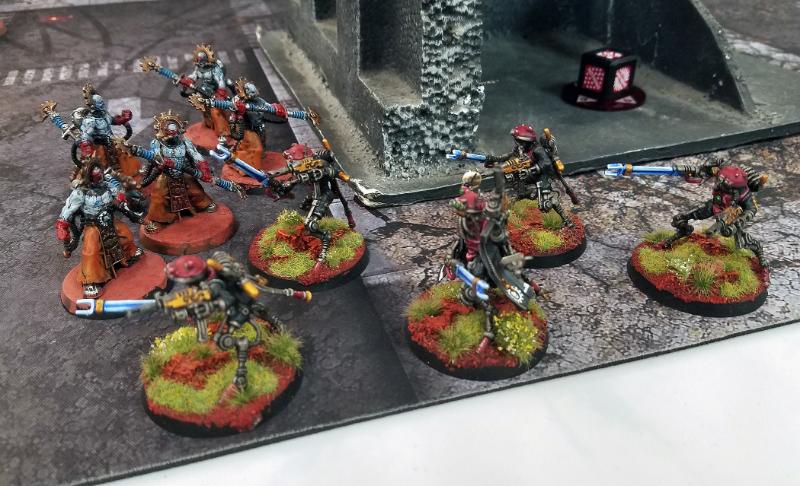 Here's the fight on the right. Started well as I took out his dune striders without casualty... but hell was coming to dinner in the form of a full squad of vanguard and some rust stalkers.