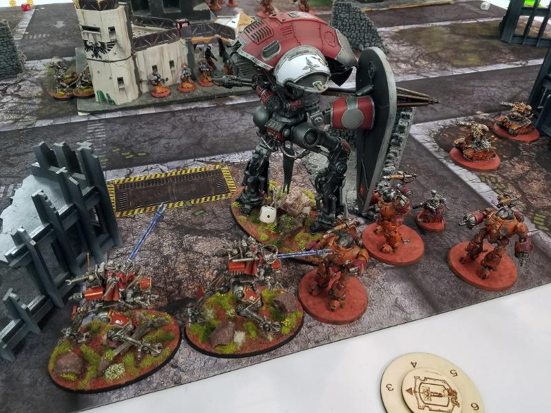 Here's a good table view. You can just barely see his infiltrators moving into the ruins on the left. My knight took out two of his oncoming rust stalkers on the right and has scooched over to help with the right flank. He's just out of range of the GtG grav servitors.