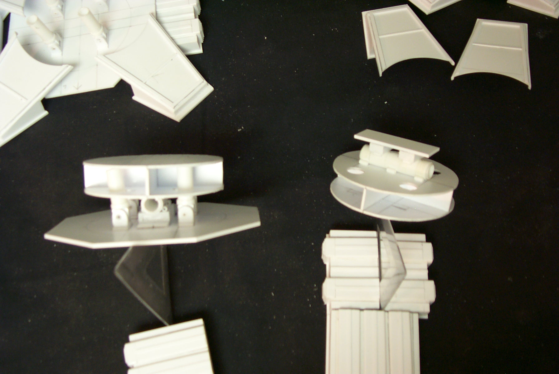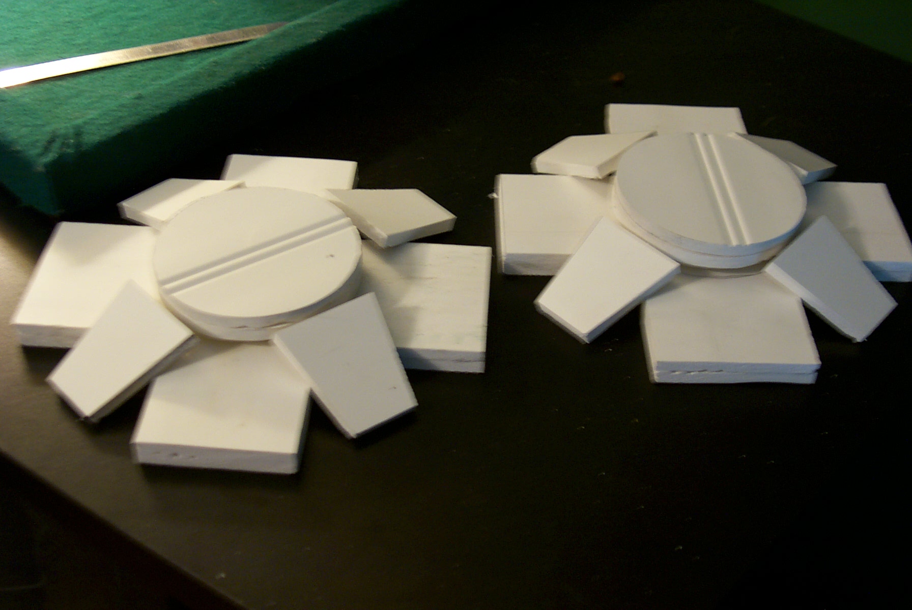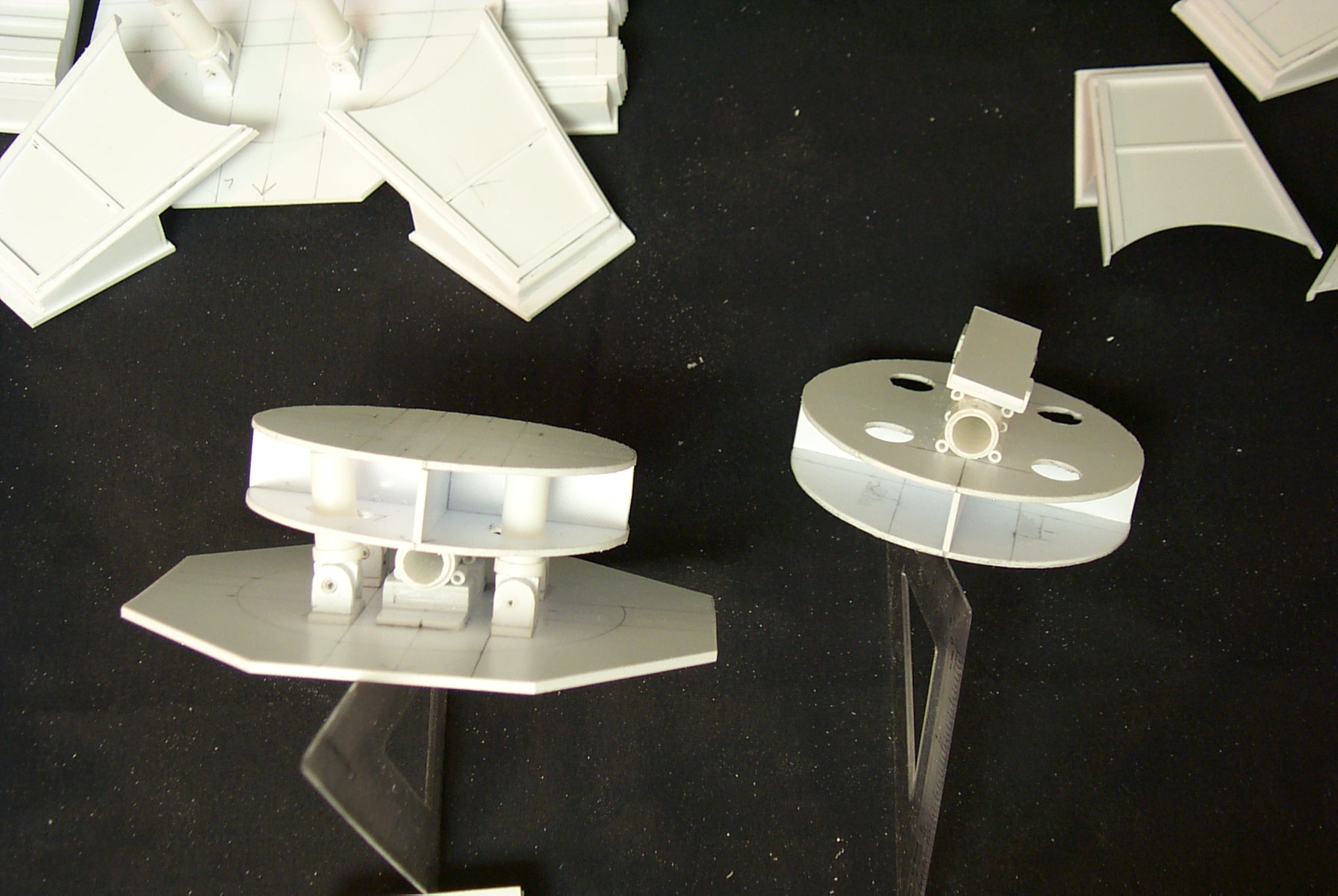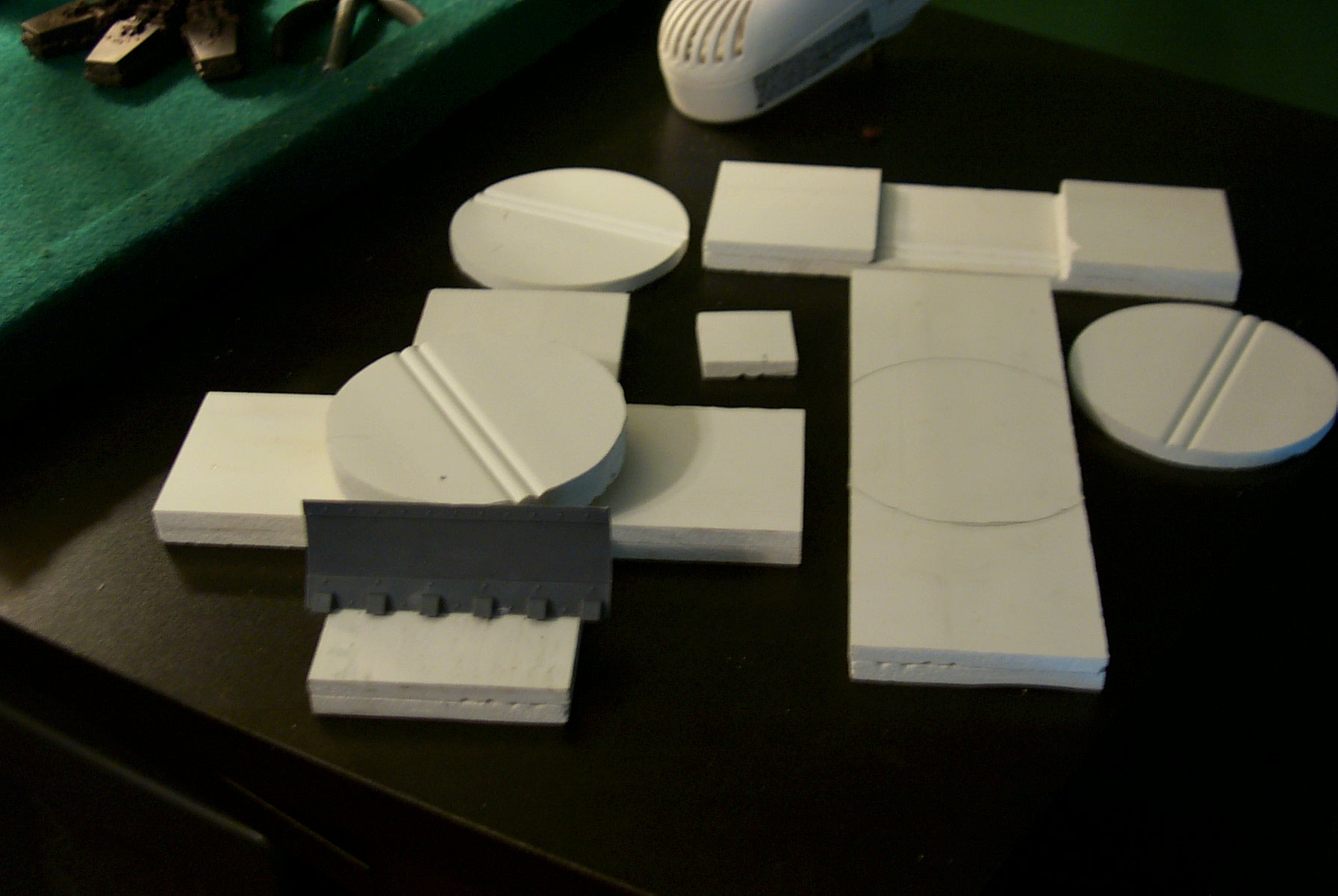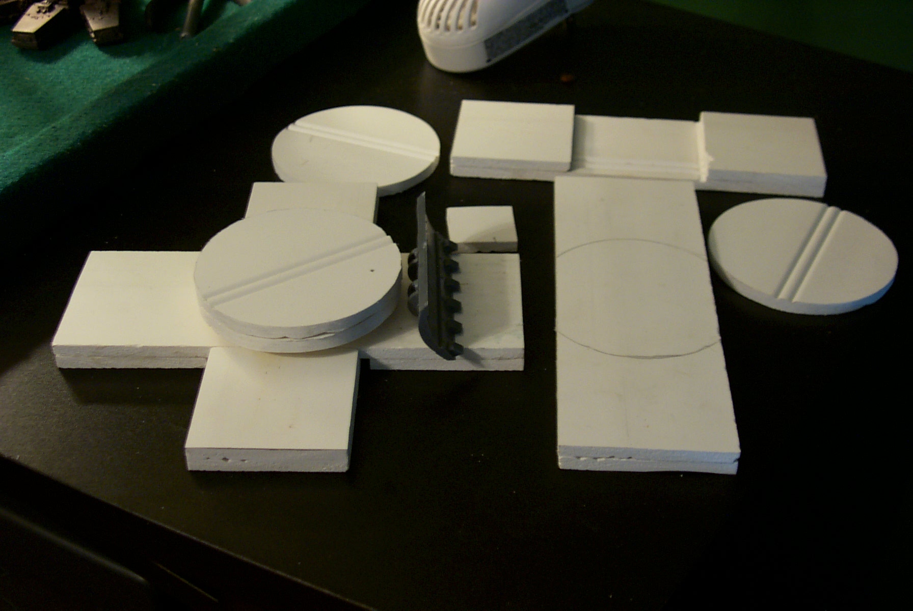 I had some scrap left over from the laundry room paneling (Enough to build half a dozen Titans) and it welds together well with Testors styrene cement. I've got 4 disc pads and the cross pad toes cut out and they are drying as I type. The paneling is 1/4 inch thick so a double interlocking assembly will give the strength needed to support the superstructure and provide a basic structure for the detail. Instead of using foam core poster board I think I will use this material for the whole structure; it's strong light and easy to cut with a cheap table saw and Dremel scroll saw.