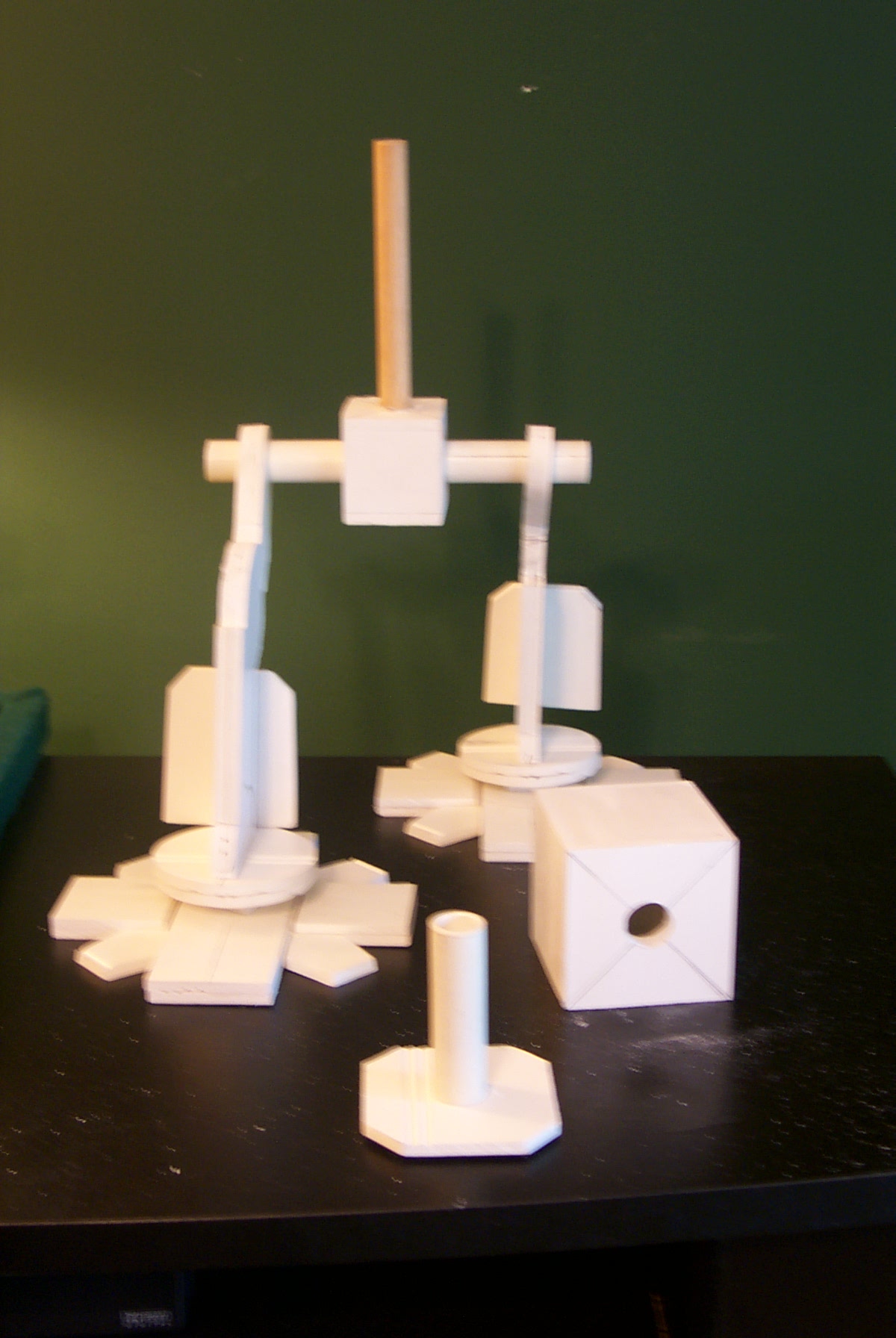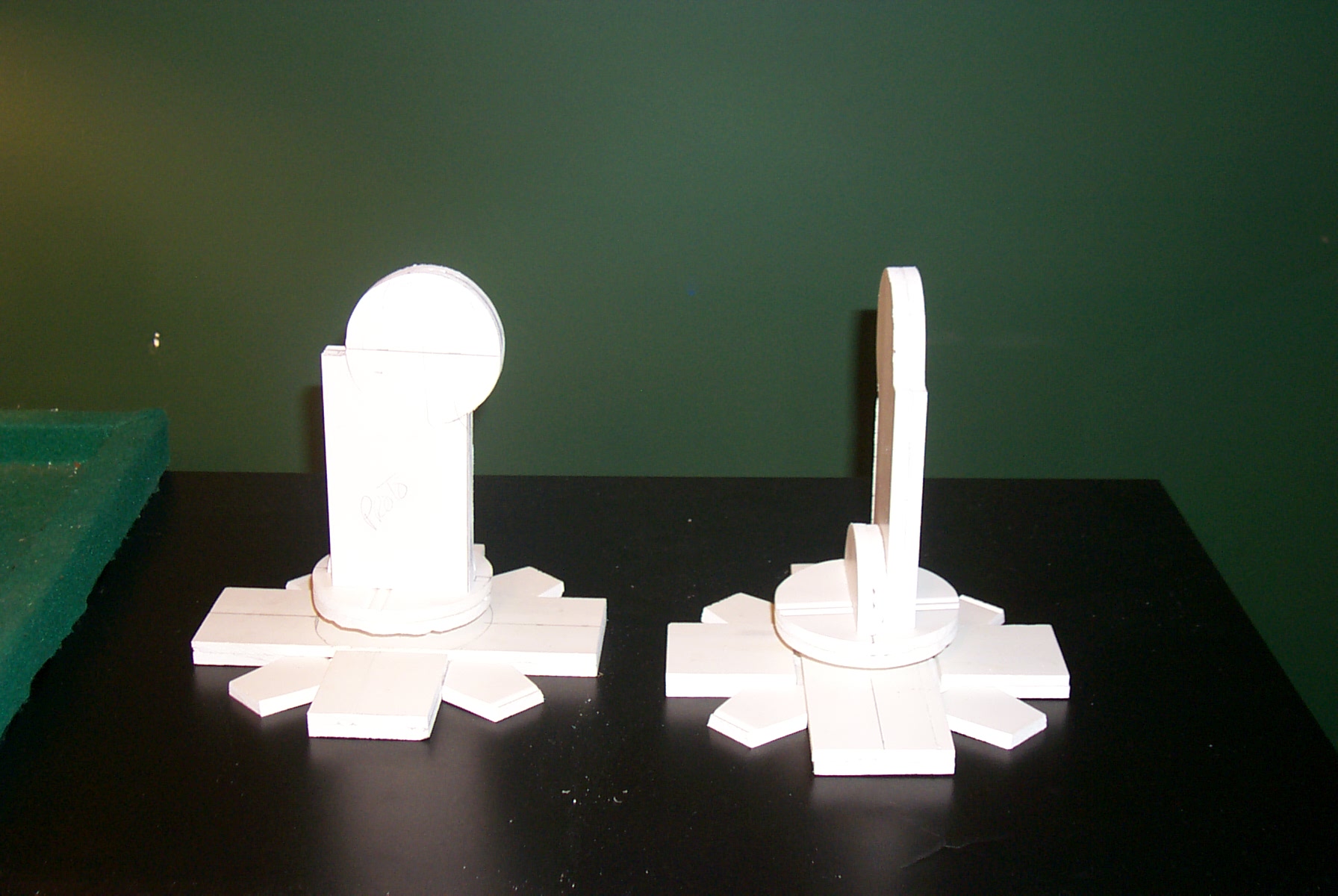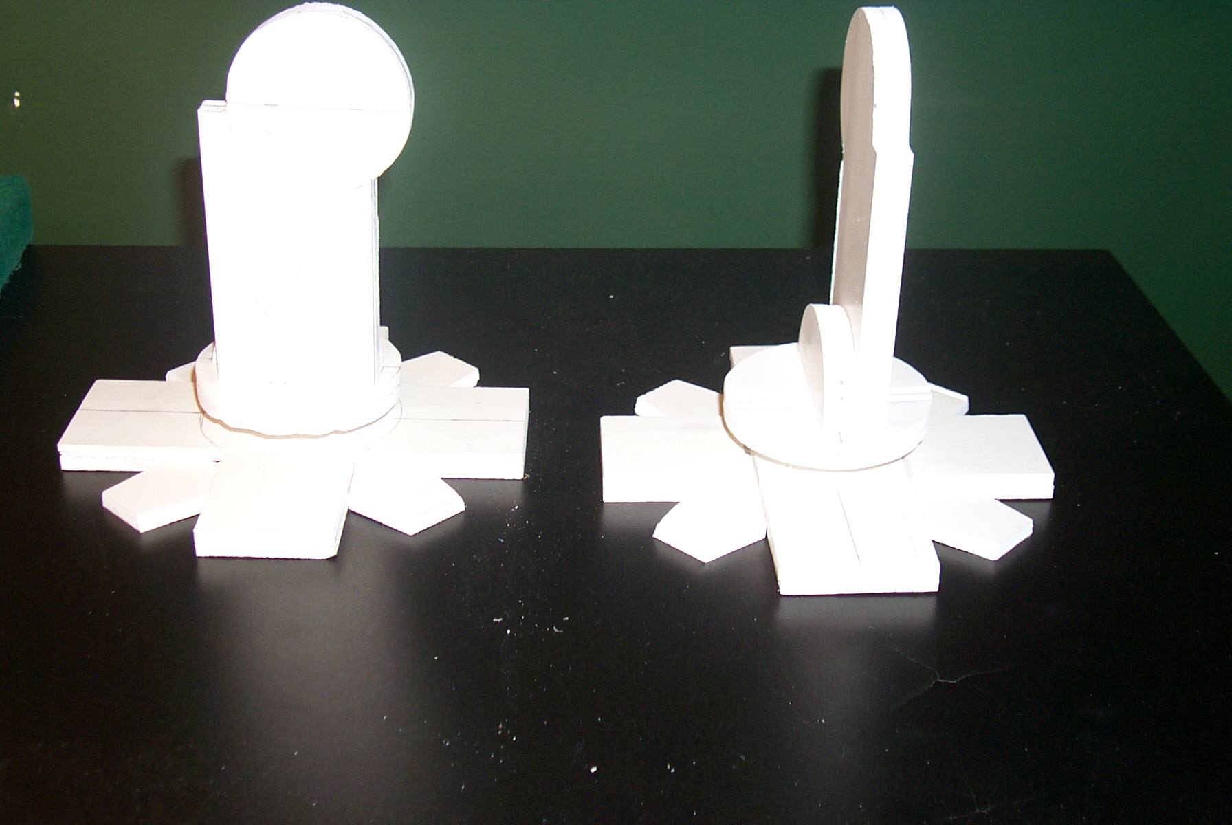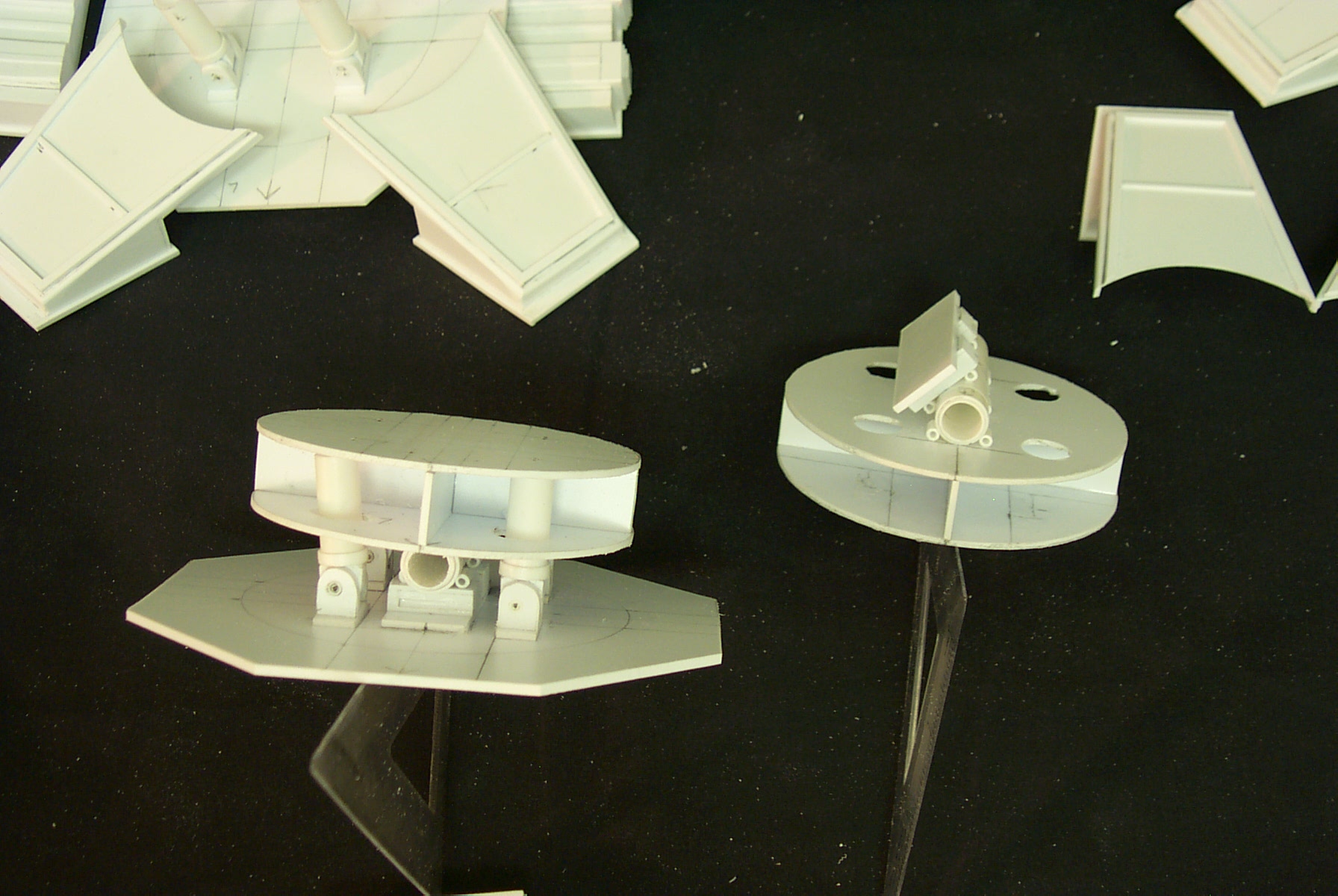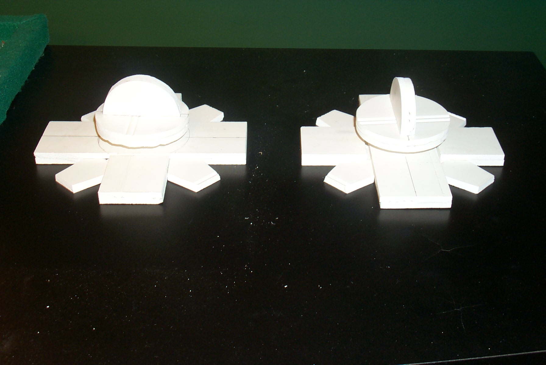 I had some scrap left over from the laundry room paneling (Enough to build half a dozen Titans) and it welds together well with Testors styrene cement. I've got 4 disc pads and the cross pad toes cut out and they are drying as I type. The paneling is 1/4 inch thick so a double interlocking assembly will give the strength needed to support the superstructure and provide a basic structure for the detail. Instead of using foam core poster board I think I will use this material for the whole structure; it's strong light and easy to cut with a cheap table saw and Dremel scroll saw.