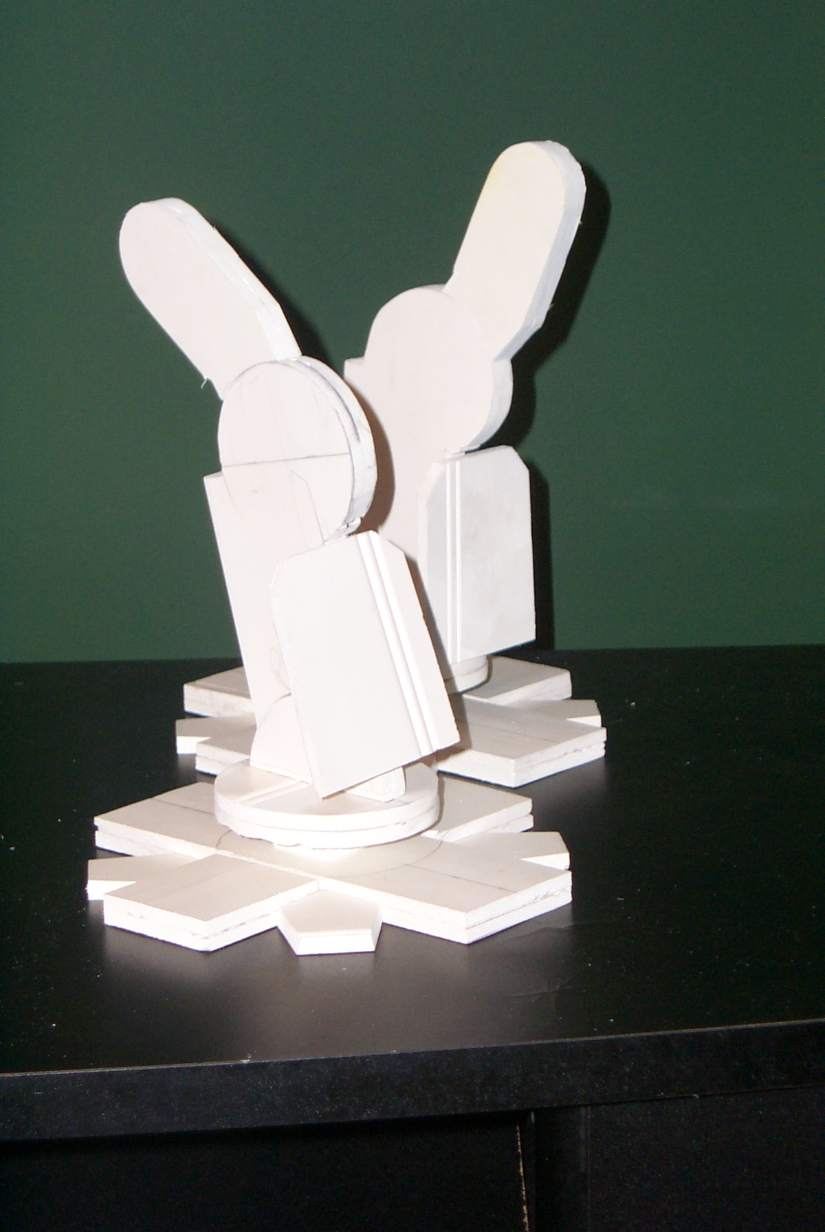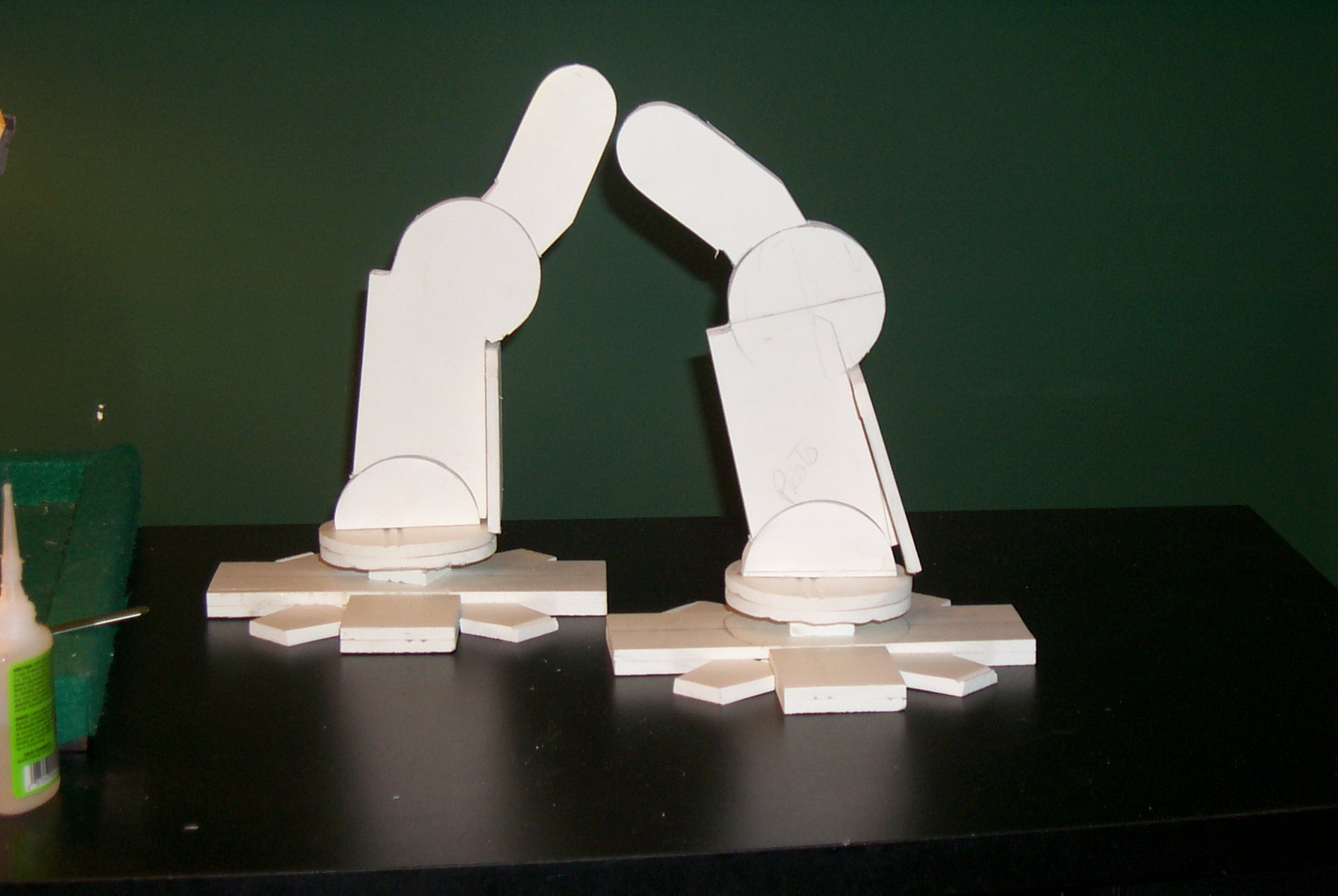 At any rate I assembled the basic foot shape and they look okay to me so today I started on the lower legs. Mind you This is just a prototype dry run to see if the proportions are correct. If they are so much the better and they will become the basic structure for the styrene skin and appropriate gewgaws and bells and whistles. If not I may be able to salvage the work with layers of styrene which will serve to strengthen what is already a sturdy construct.