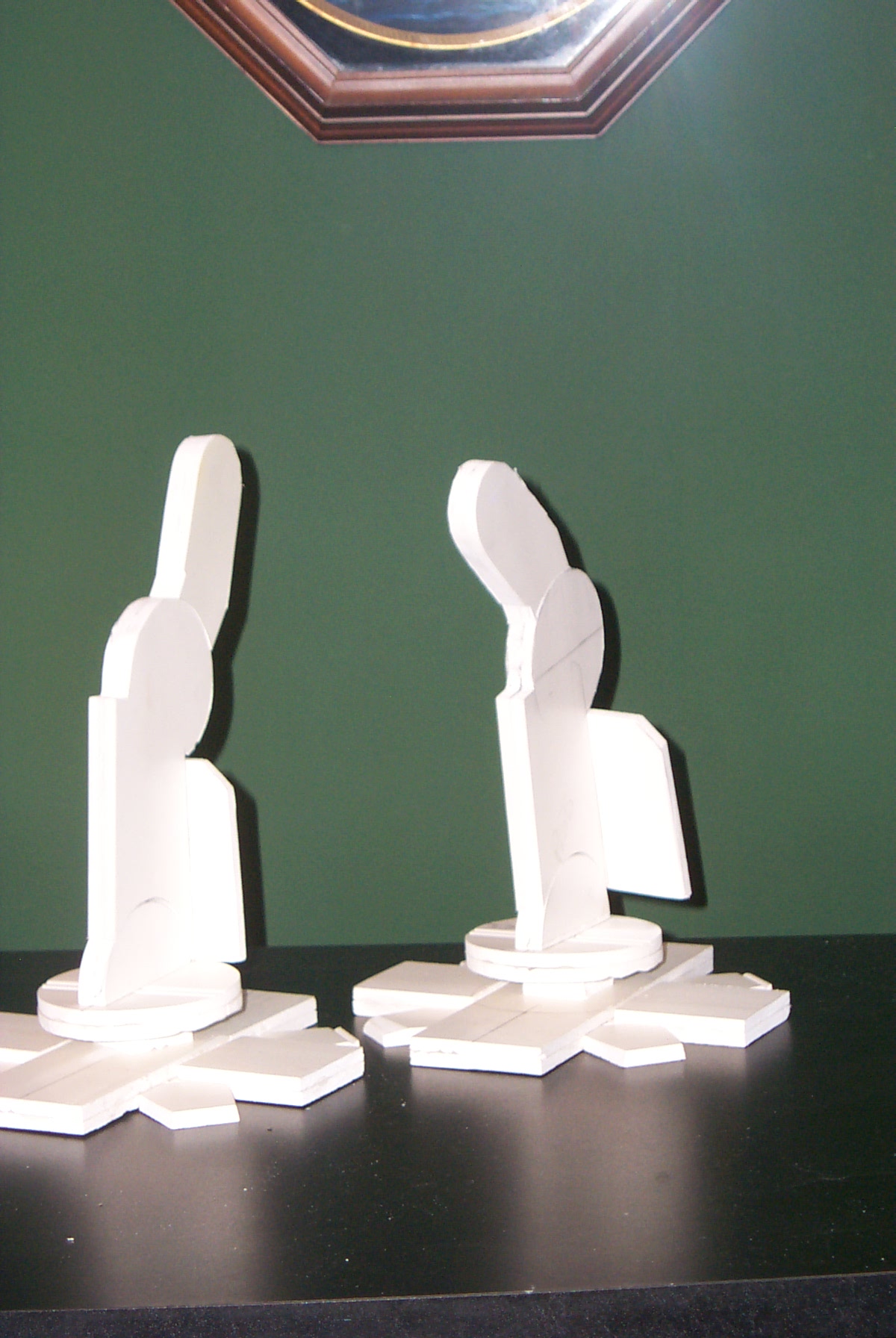 Man I've come a long way today and here are the pictures to prove it. As I suspected this will be an easy model to build as the joints are large and easy to assemble. I am going to use steel bolts and nuts for the axles on the joints. To re-pose the model will be as simple a losening the bolts posing and re-tightening the bolts. This will be necessary as the model will probably weigh quite a bit when finished. Anyway here are the legs tack glued together just for scale and Lucie standing by likewise.