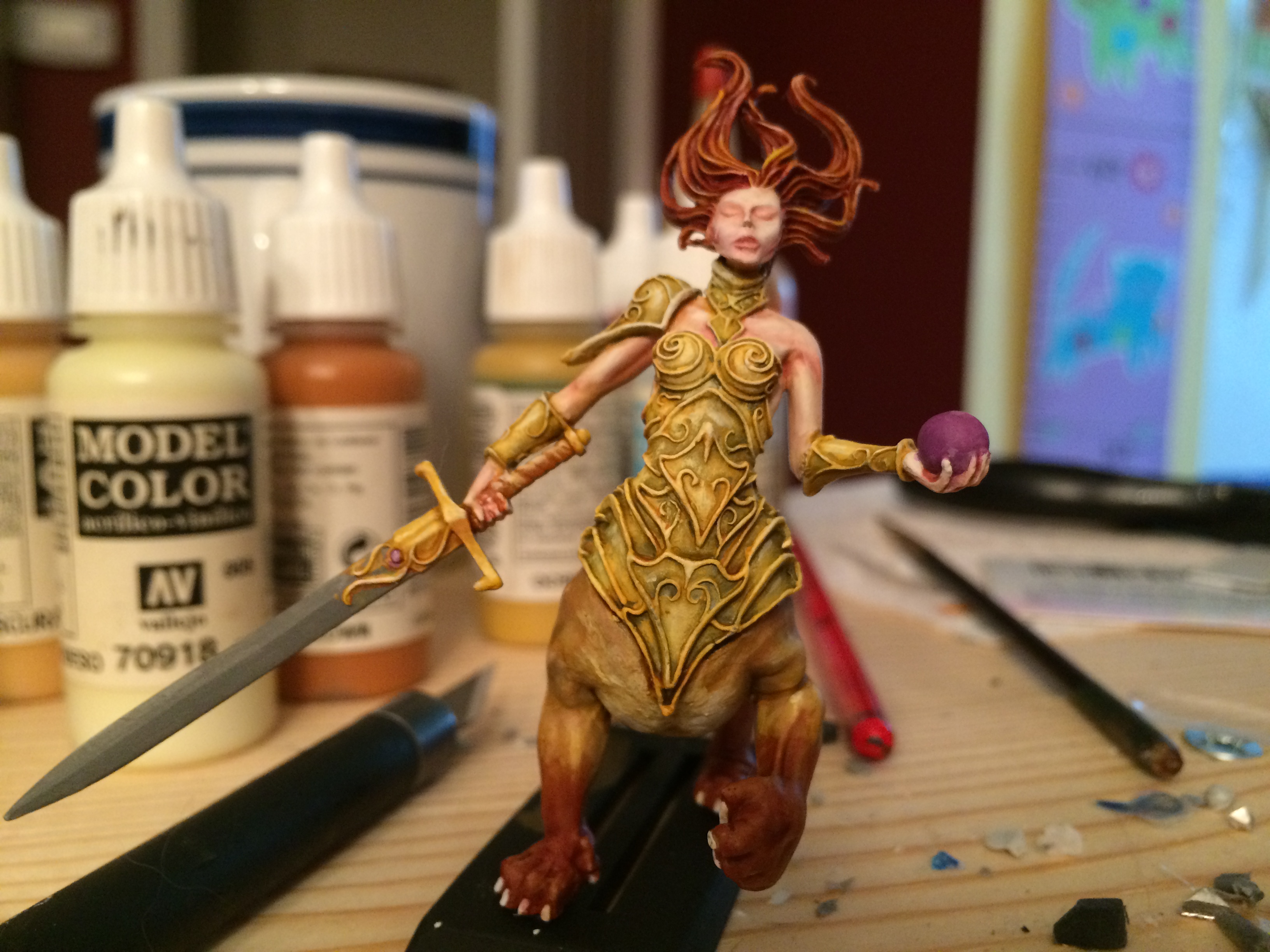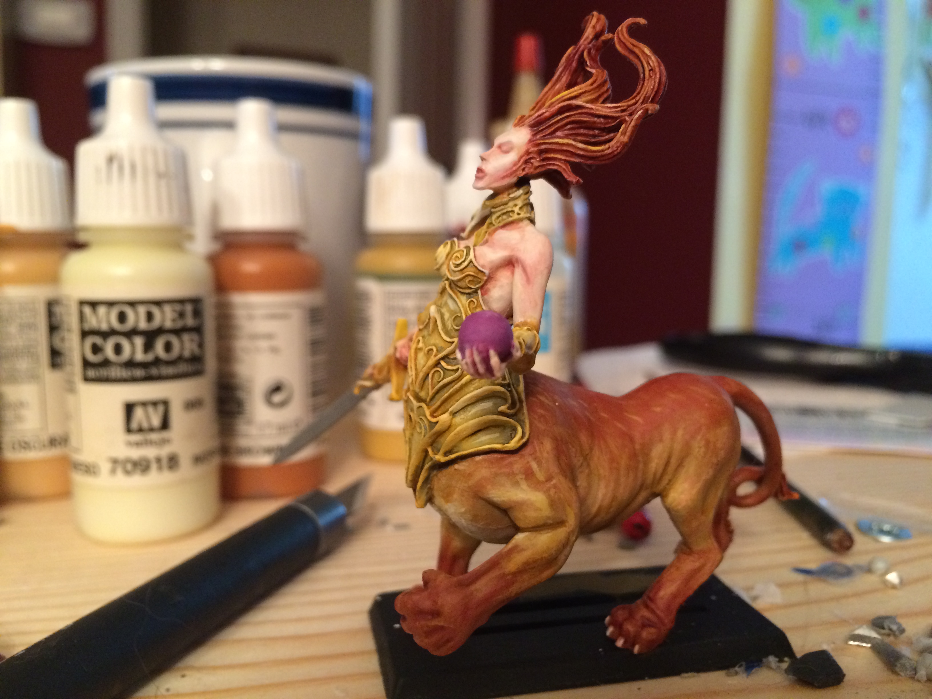 The Sorchimera, after nearly half a decade on the paint bench across 2 states and 4 cities is finally going to get finished. Armor is mostly done, as is her skin and lion parts. Just some more shading to do on the latter two, and perhaps something to make the lion bits a little more angry looking. I want to play up the juxtaposition of light and beautiful female human on top with heavy and brutal lion on the bottom.