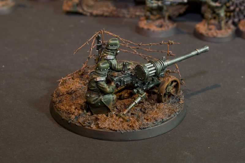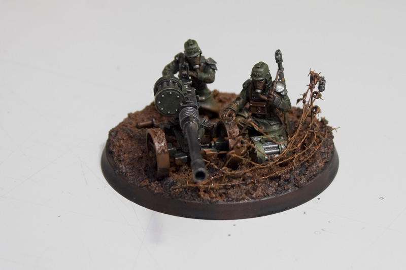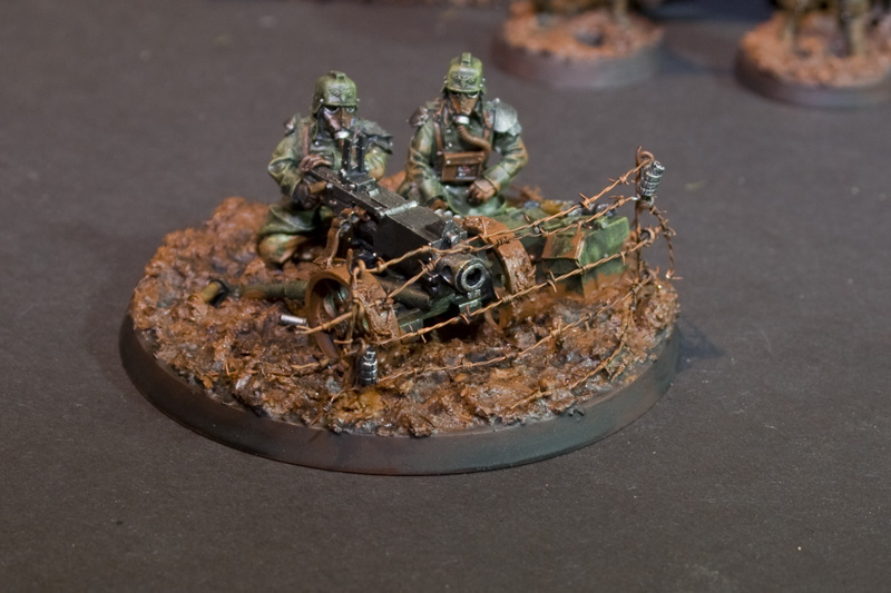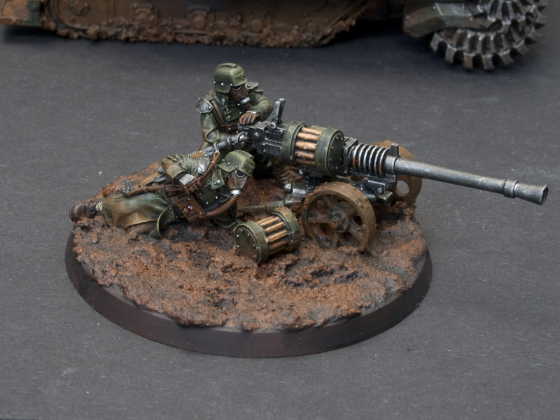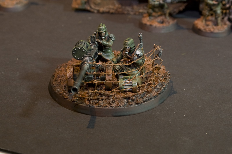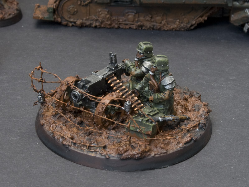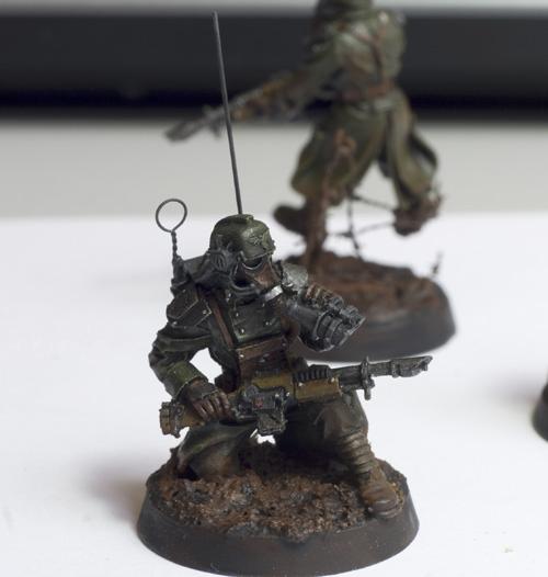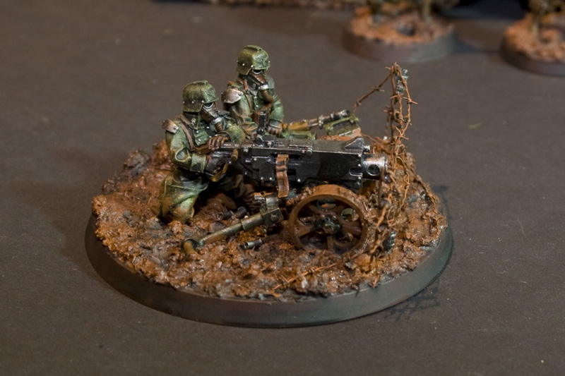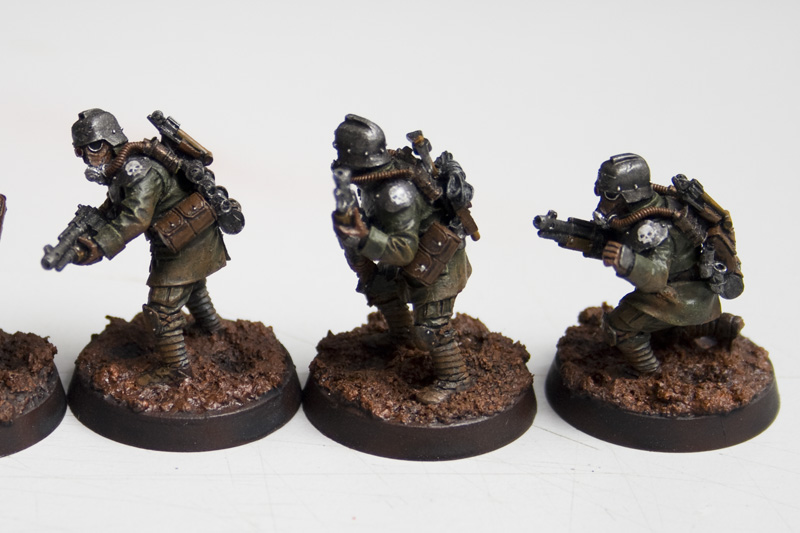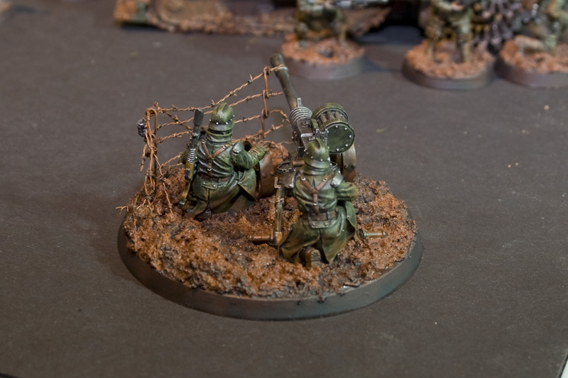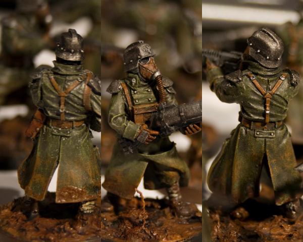 I love the fact that you are really bringing out the dirty feel in trench warfare with these guys. Minor critiques though: Try doing some Badab Black washes thinned down as it will add much more depth to the models. Atm they look as if they were dry brushed and even if they were this will give a much better feel and take out the monotone style to them. Also try doing a lighter color to the eyes as this will set it apart nicely and allow them to stand out more.