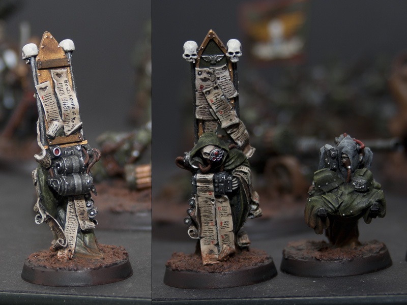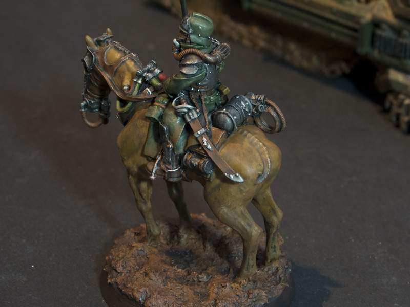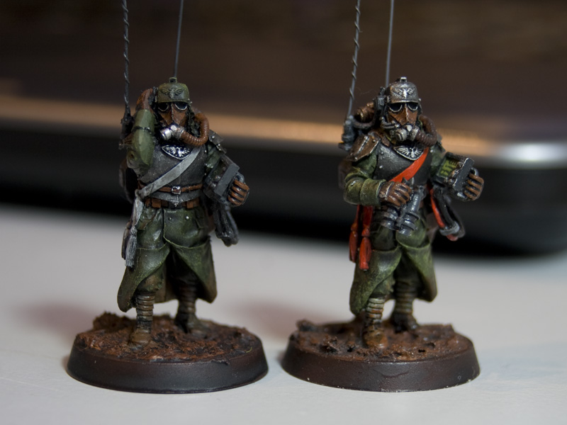 Well, the green is Catachan Green, washed with Badab Black, lightly brushed with Camo Green. The leather is Bestial Brown, washed with Badab Black, basically everything is washed Badab Black.  Only the mud on the ground is washed Devlan Mud. The mud on the coat is not washed. But I'll think about your suggestions and how I can try this. Thx PDH wrote:Really like the dark green colour scheme and mud. I agree with Commander Cain your HQ looks great with the white detailing making him pop. Looking forward to seeing the Engineers (some of my fav models - the revolver barrels on the shotguns genius) and Grenadiers.