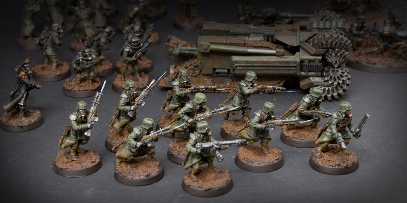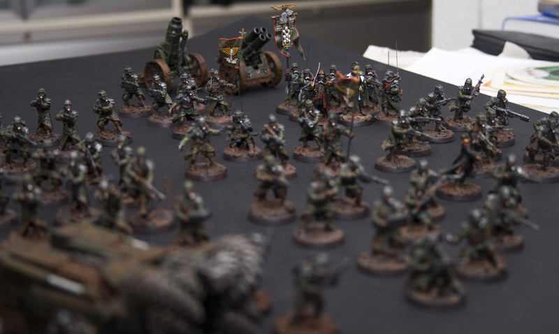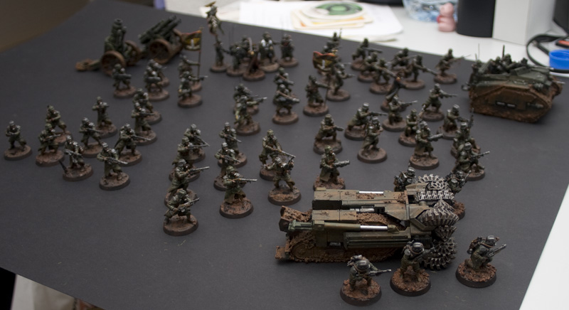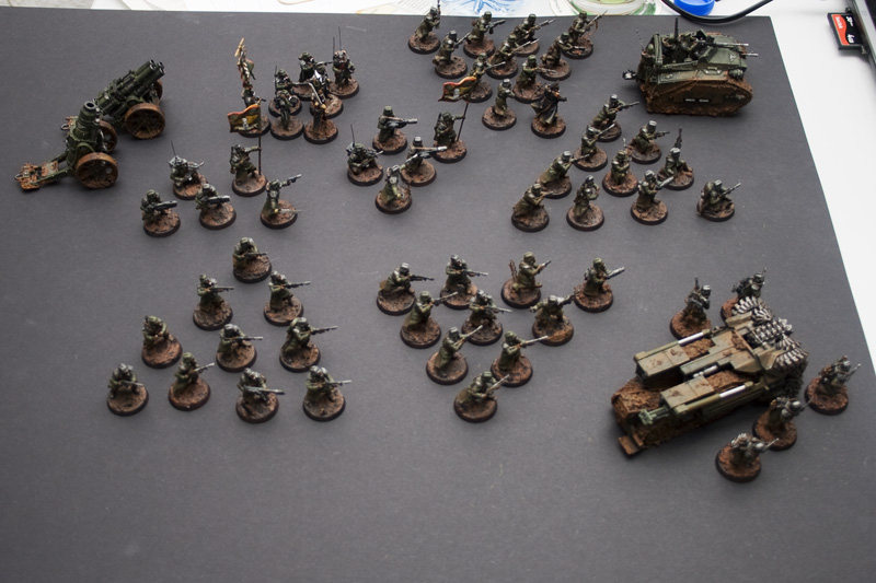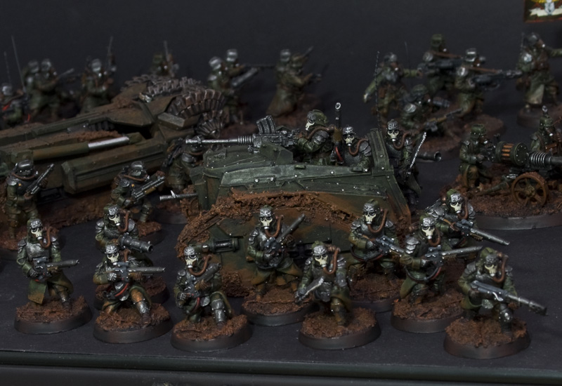 TEASER:  3 combined squads (already shot down) as close combat squad with pistols, commissar and Quartermaster (Feel no Pain) at the main objective.  Land-Raider-Killer: 5 Engineers with Melter Bombs and Hades Breaching Drill. The drill immobilized the LR on the left and the Melter Bomb immobilized the LR on the right. Another Melter Bomb destroyed the main weapon of the LR on the Left. Only then did the first engineer die.  Without cassualties: The artillery hill Company Command with Master of Ordnance and Heavy Bolter. Artillery: Thudd Gun and Heavy Mortar. In the front: Autocannons To the left: Watchmaster of the grenadiers in a backwards movement as a reaction to losing all 9 men - after killing all standards of the enemy so that noone would get that objective.