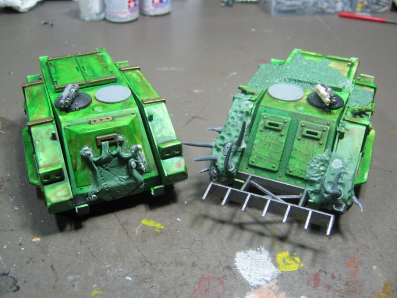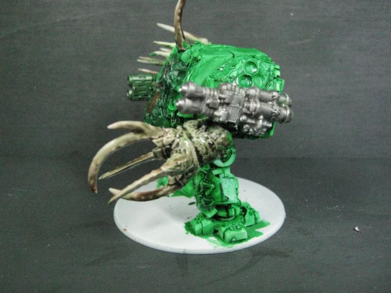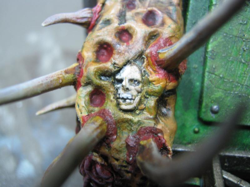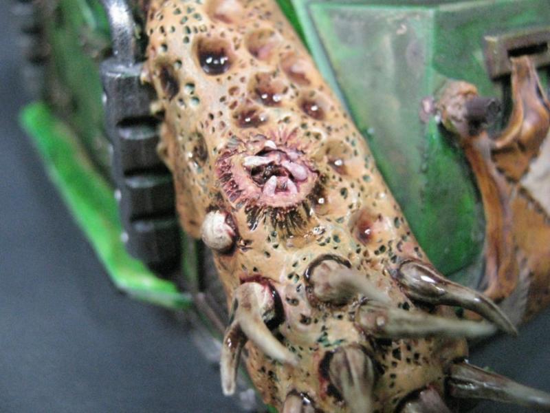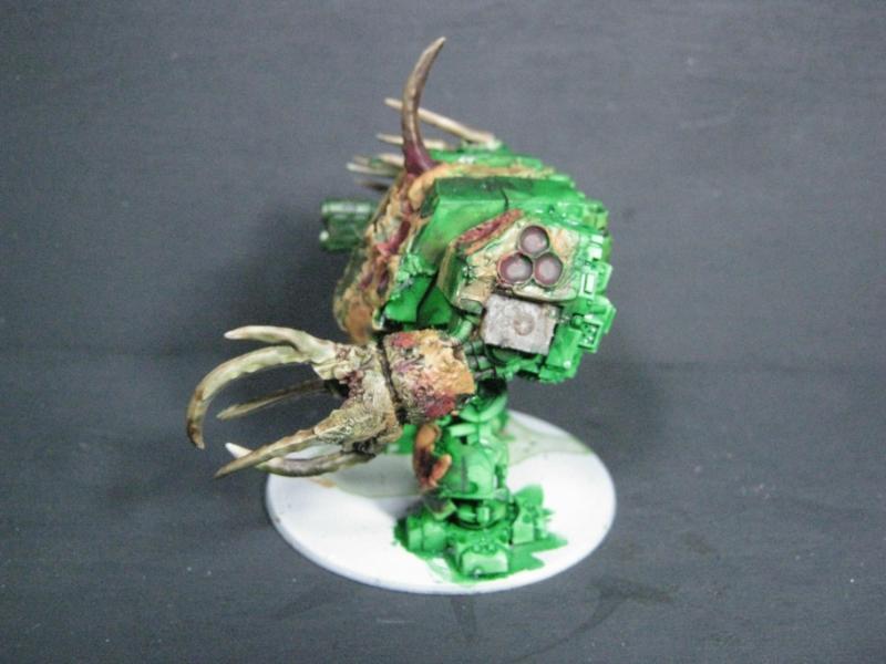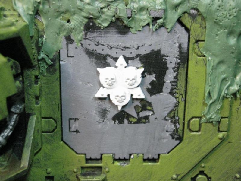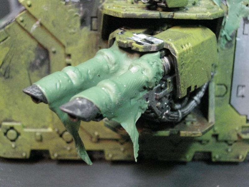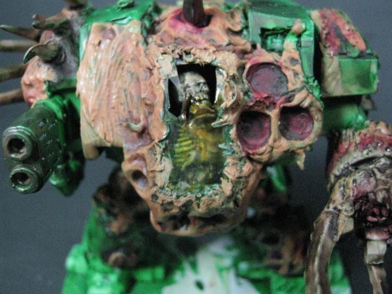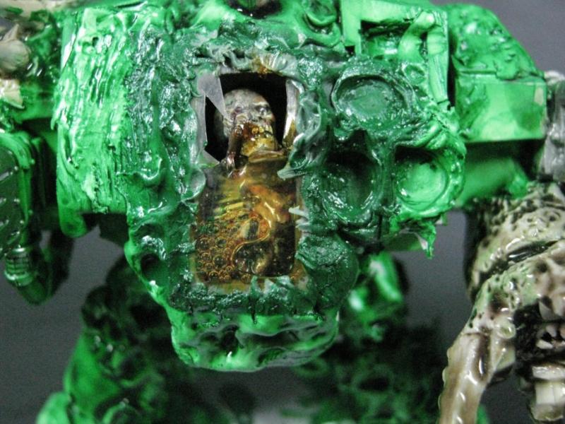 I genuinely thought about re-doing the one I messed up, but I'm going to leave it as is. If Papa Nurgle wanted a pus-filled tank, he'd have a pus-filled tank. The broken glass makes it even the more disturbing really, if you think about it. A venerated Death Guard Plague Marine encapsulated in a life-support system, head lolling around, eyes wandering to and fro, electrical impulses triggering instantaneous and flawless response from the behemoth of a machine he is wired into... is he literally looking at you, or is that just a sensor?