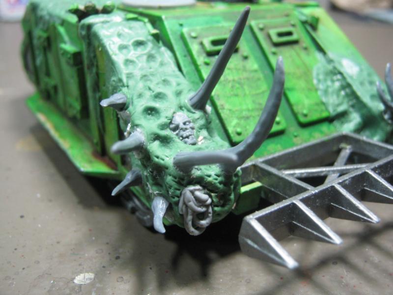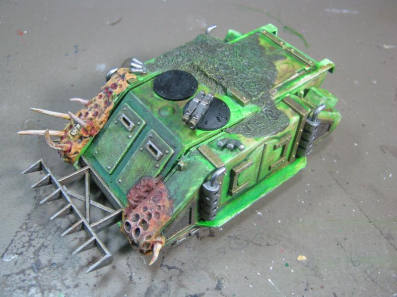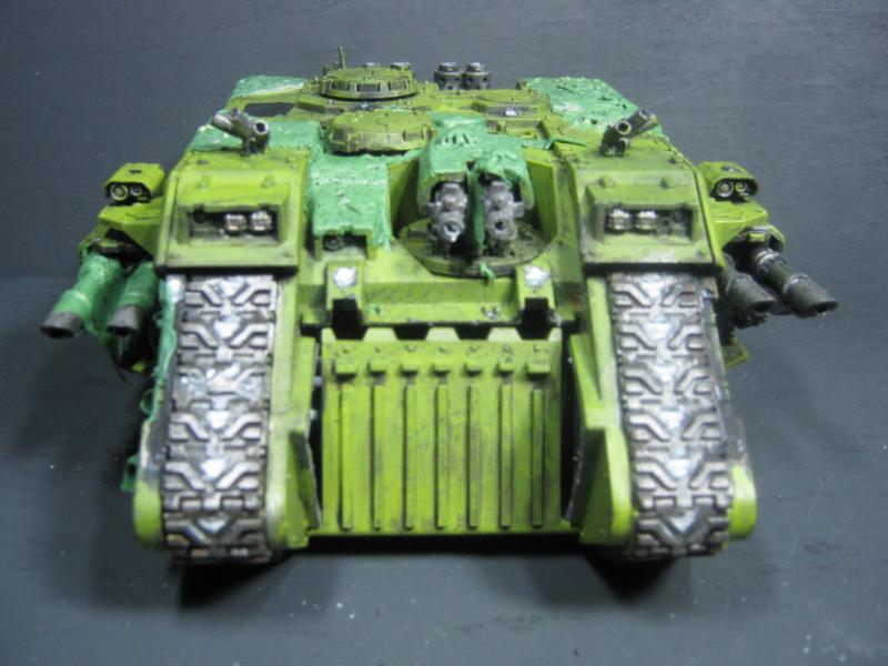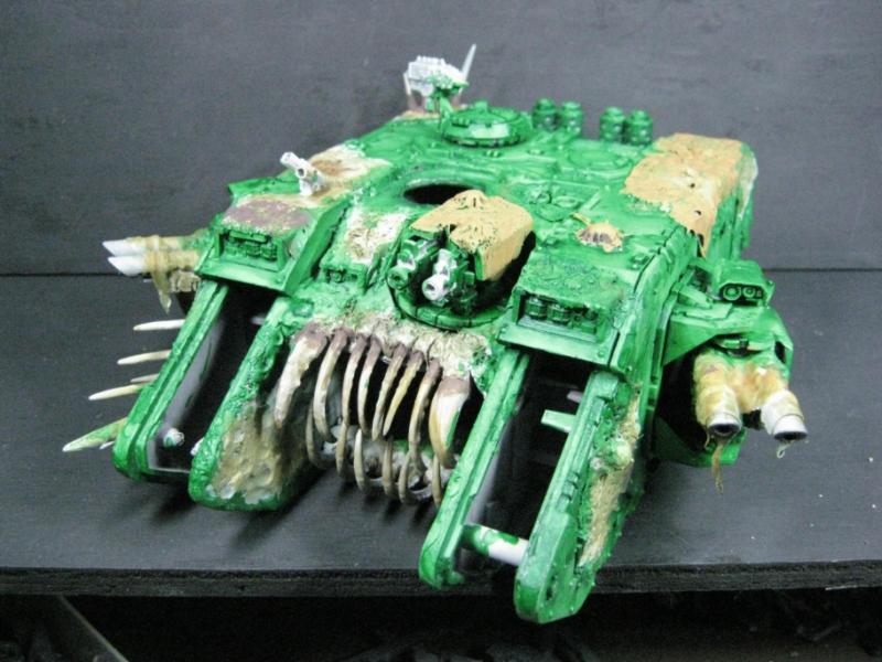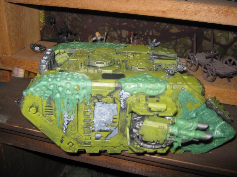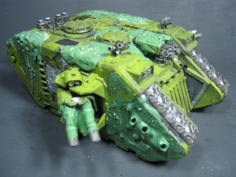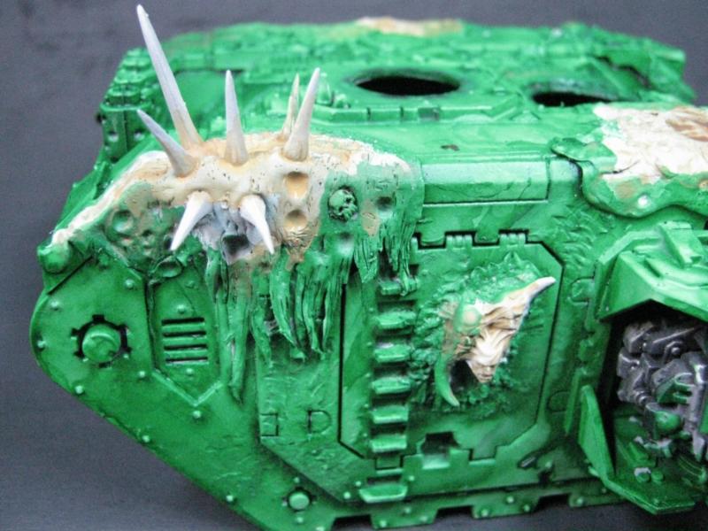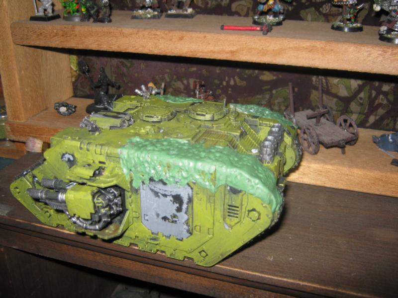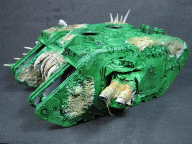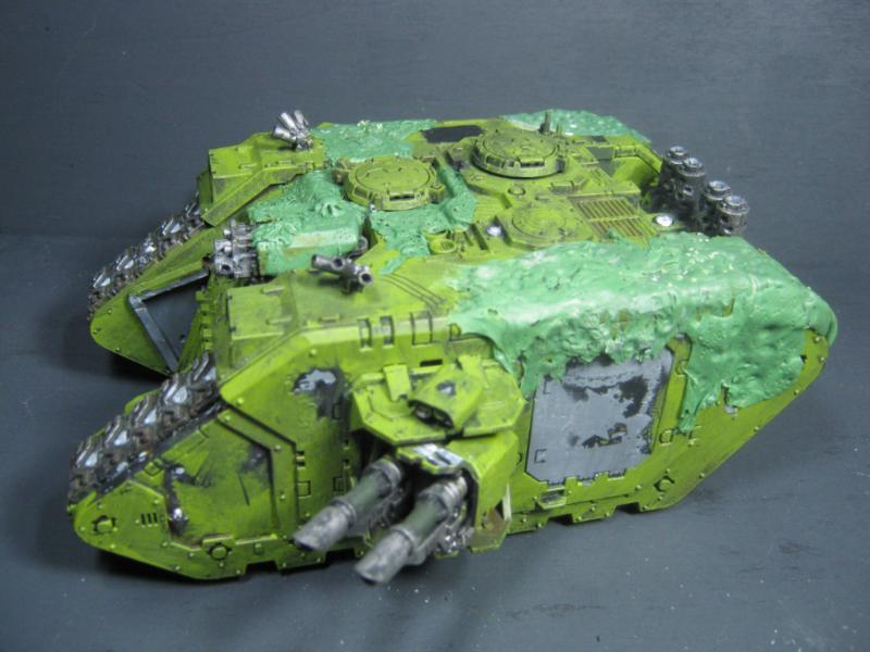 @ Moltar- Glad you like it. Creating a feeling of nausea is the highest compliment for a hobbyist that focuses on Undead and Plague Marines. My wife has accepted my -addiction- hobby and is quite cool with it. Besides, she was asleep for most of that. Ha. Regarding the tone, I'm going to give washing it down one more try. I'm going to mix a new batch of ink, but on the Land Raider I'm going to try a mix of Red Gore and maybe Snakebite Leather into the ink pot I already have, just need to tone down the whole "neon" feel. I have no interest in adding any sort of Slaanesh element to my Death Guard. Though I do have a pot of Chestnut Brown, I will try that first. Thanks for the idea. I'm really looking forward to completing this project because it will without a doubt be the centerpiece of my entire army, plus learning how to properly apply it in a tactical sense will most likely turn my current losing streak around. I have a very powerful army if I use it correctly. Battle Wagons with Deff Rollas? Whatever. Bring it on. Ha.