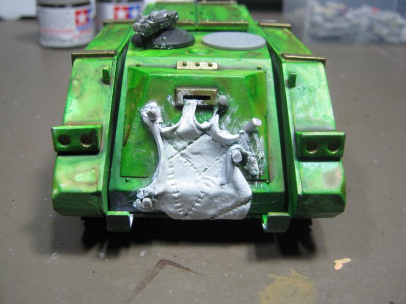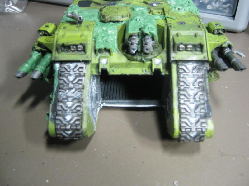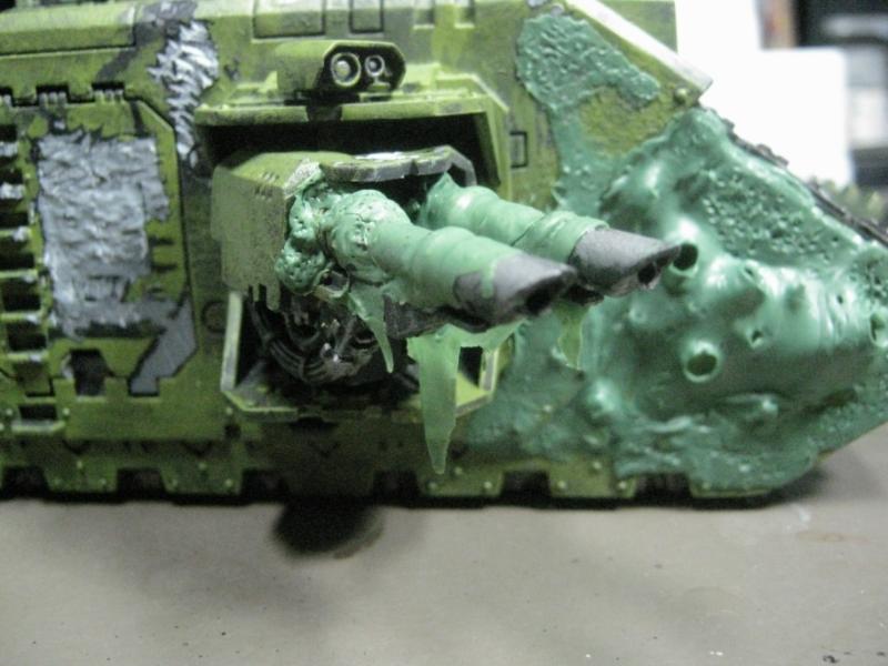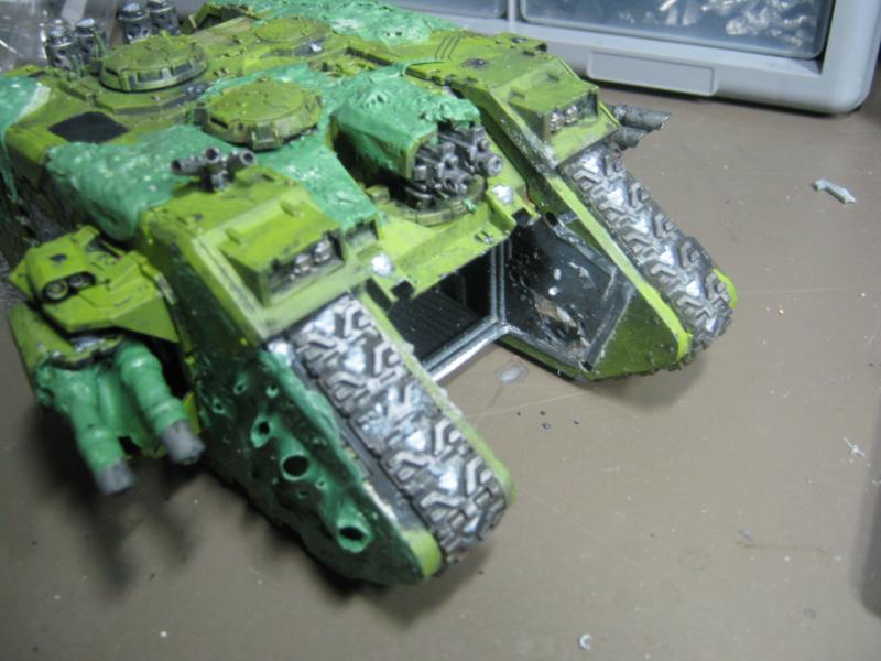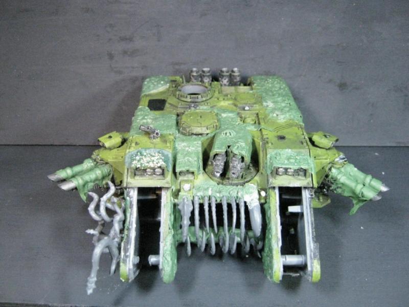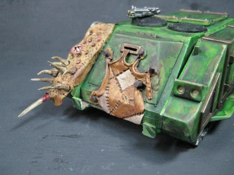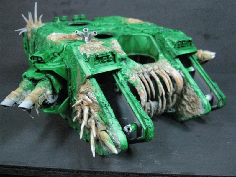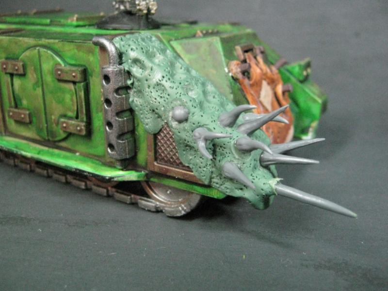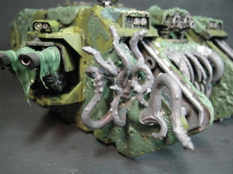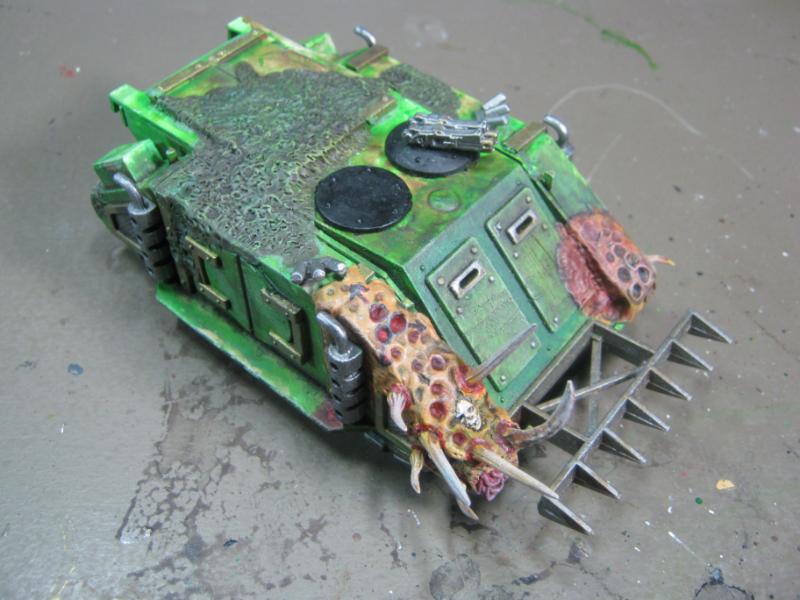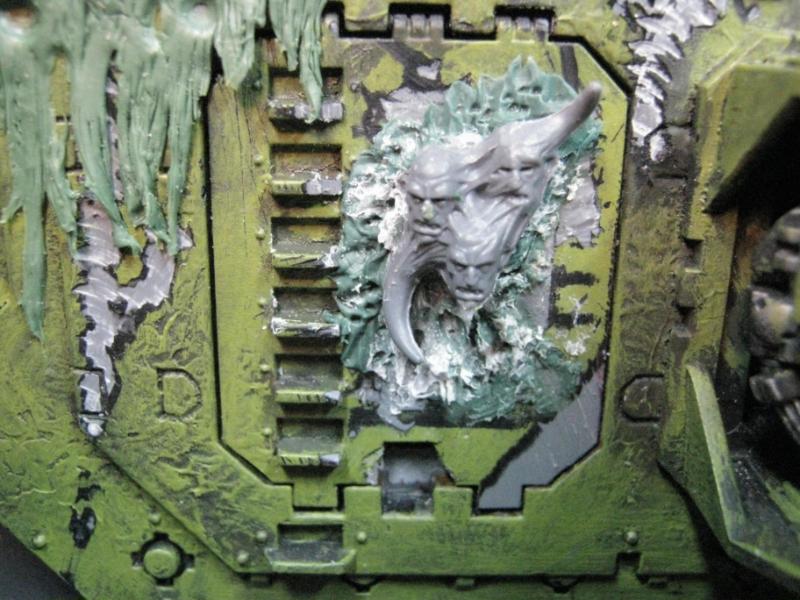 @ Moltar- Glad you like it. Creating a feeling of nausea is the highest compliment for a hobbyist that focuses on Undead and Plague Marines. My wife has accepted my -addiction- hobby and is quite cool with it. Besides, she was asleep for most of that. Ha. Regarding the tone, I'm going to give washing it down one more try. I'm going to mix a new batch of ink, but on the Land Raider I'm going to try a mix of Red Gore and maybe Snakebite Leather into the ink pot I already have, just need to tone down the whole "neon" feel. I have no interest in adding any sort of Slaanesh element to my Death Guard. Though I do have a pot of Chestnut Brown, I will try that first. Thanks for the idea. I'm really looking forward to completing this project because it will without a doubt be the centerpiece of my entire army, plus learning how to properly apply it in a tactical sense will most likely turn my current losing streak around. I have a very powerful army if I use it correctly. Battle Wagons with Deff Rollas? Whatever. Bring it on. Ha.